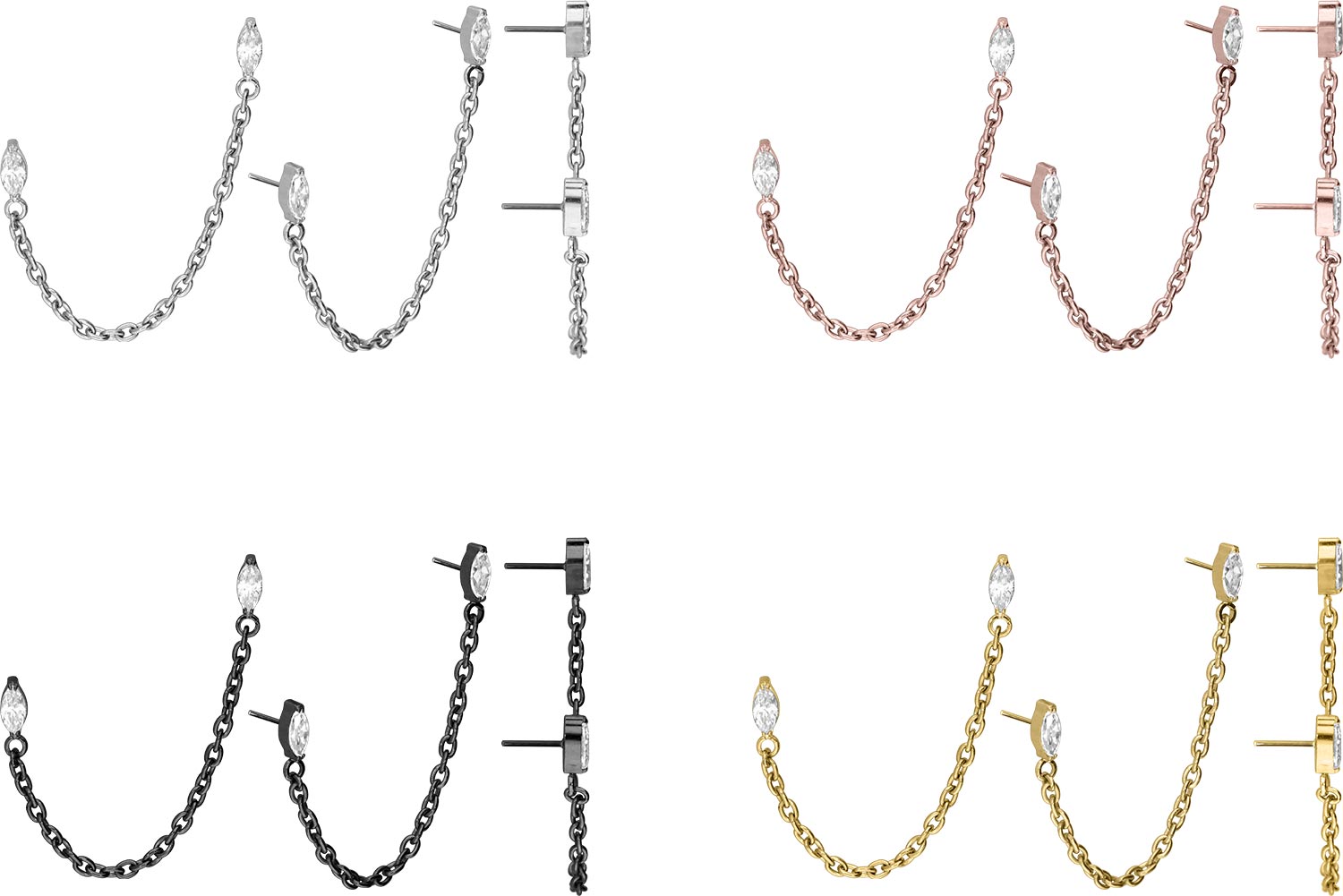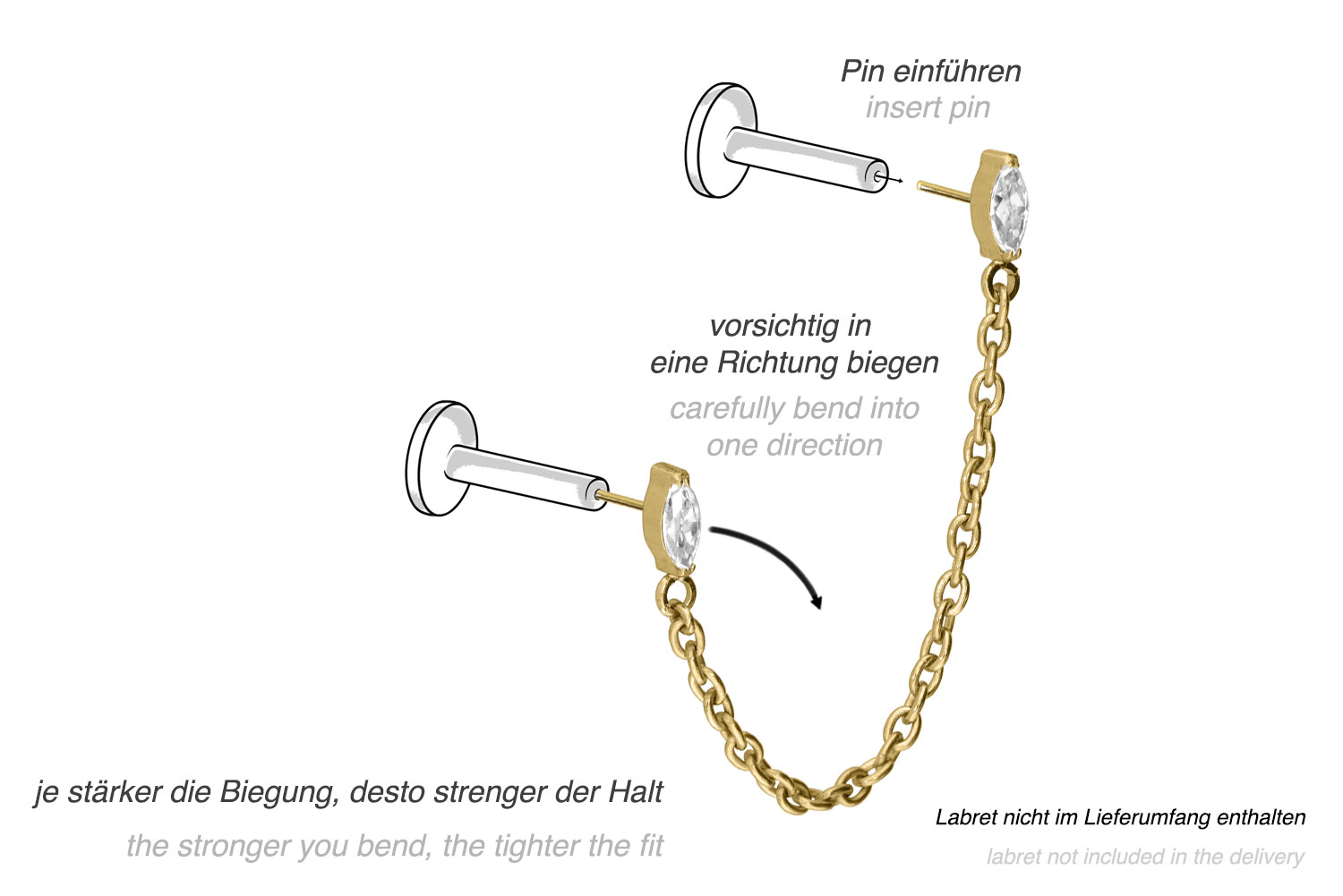 Dieser einzigartige Push Pin Aufsatz in Form von zwei separaten Kristalltropfen, welche über eine Kette miteinander verbunden sind, wurde speziell für unsere Push Fit Piercings entwickelt und besteht aus hochwertigem Titan, das sich unter anderem