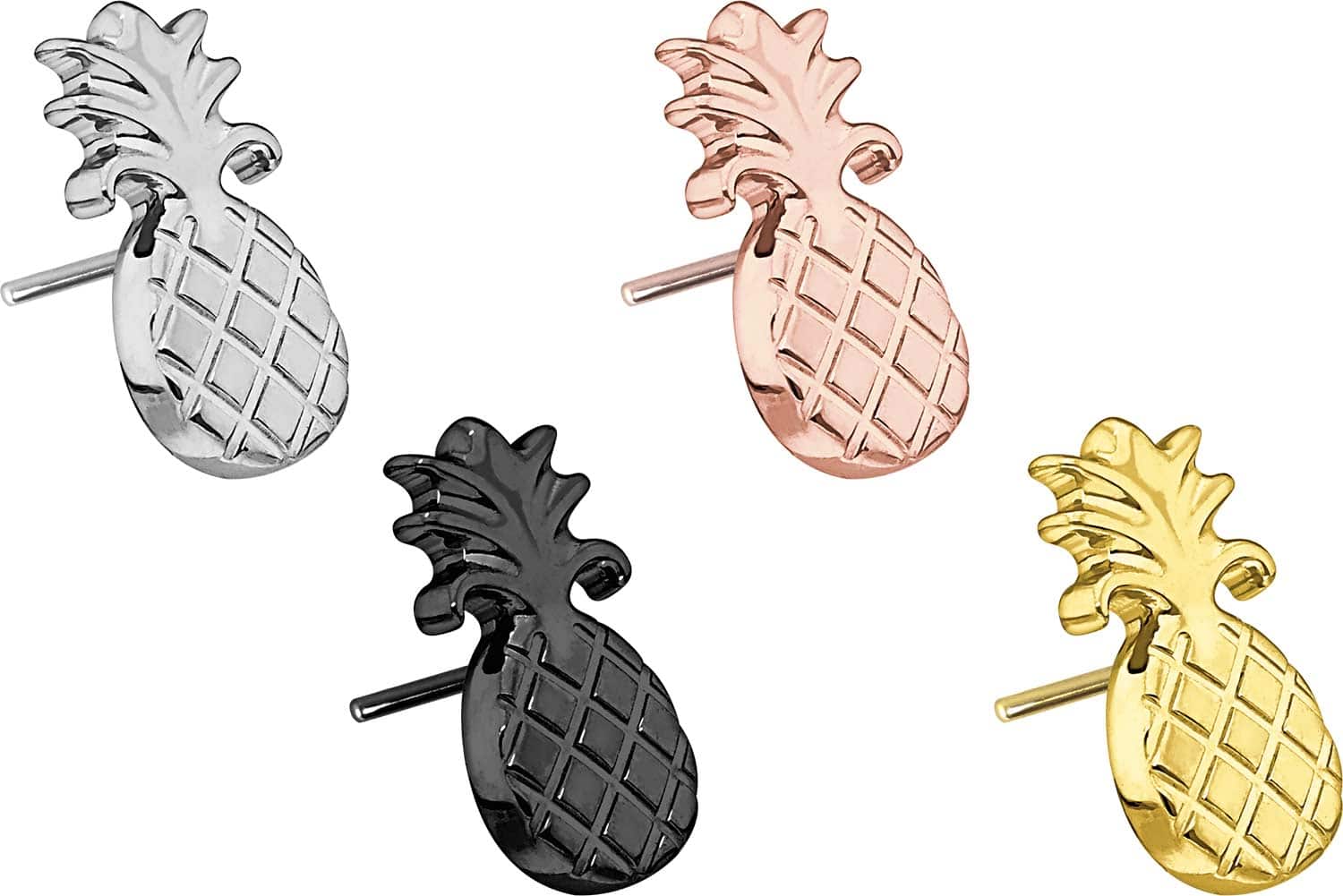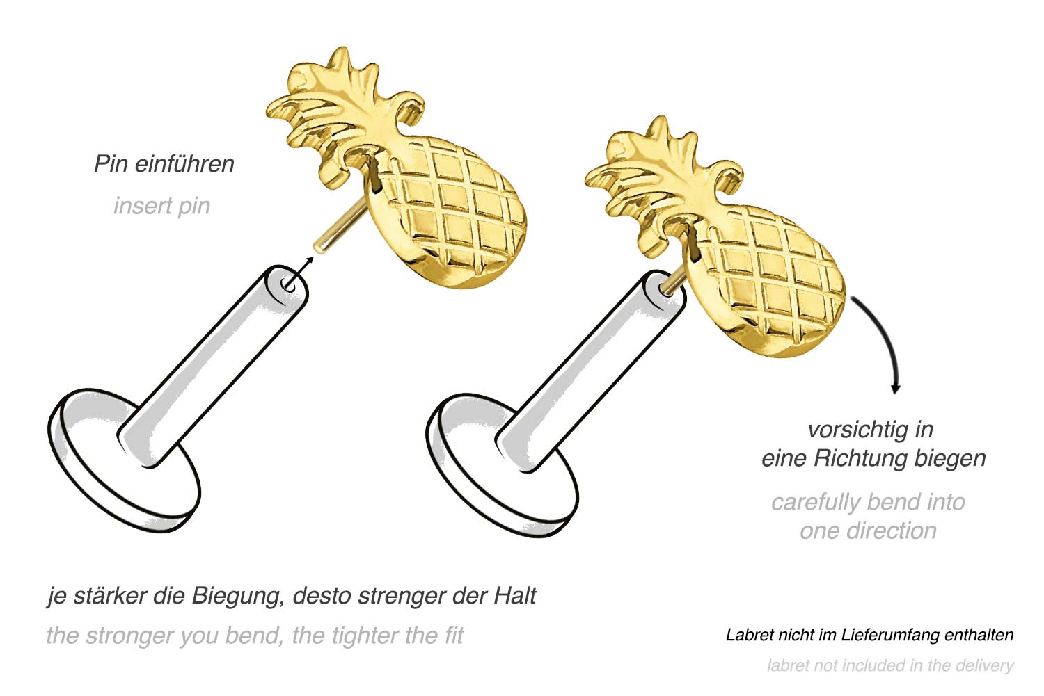 Dieser einzigartige Push Pin Aufsatz in Form einer Ananas wurde speziell für unsere Push Fit Piercings entwickelt und besteht aus hochwertigem Titan, das sich unter anderem durch gute Hautverträglichkeit und hohe Beständigkeit auszeichnet. Ebenfalls zu seinen spezifischen Materialeigenschaften gehört Farbechtheit, die sowohl bei der silberfarbenen als auch bei der schwarzen, gold- und roségoldfarbenen Variante mit PVD-Beschichtung gewährleistet wird. Zum Einsetzen muss der Pin nach Belieben gebogen werden. Es ist zu beachten, dass ein festerer Halt gewährleistet ist, wenn der Pin ein bisschen stärker gebogen wird. Darüber hinaus ist der Push Pin des Aufsatzes mit all unseren Push Fit Produkten kompatibel, sodass sich vielfältige Kombinationsmöglichkeiten ergeben.