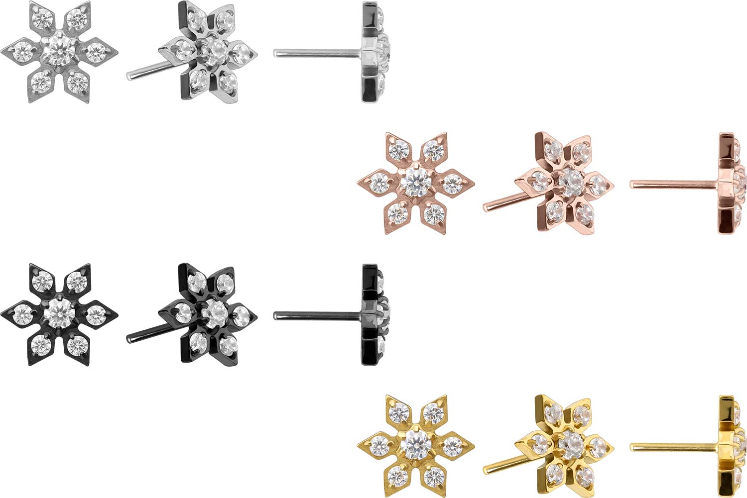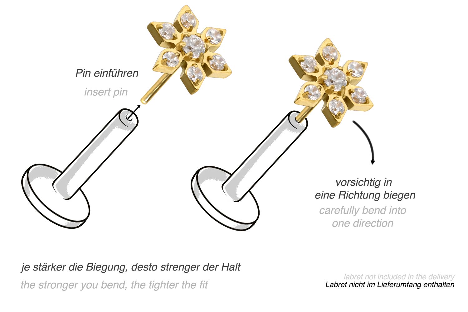 Dieser einzigartige Push Pin Aufsatz in Form einer Kristallblume wurde speziell für unsere Push Fit Piercings entwickelt und besteht aus hochwertigem Titan, das sich unter anderem durch gute Hautverträglichkeit und hohe Beständigkeit auszeichnet. Ebenfalls zu seinen spezifischen Materialeigenschaften gehört Farbechtheit, die sowohl bei der silberfarbenen als auch bei der schwarzen, gold- und roségoldfarbenen Variante mit PVD-Beschichtung gewährleistet wird. Zum Einsetzen muss der Pin nach Belieben gebogen werden. Es ist zu beachten, dass ein festerer Halt gewährleistet ist, wenn der Pin ein bisschen stärker gebogen wird. Darüber hinaus ist der Push Pin des Aufsatzes mit all unseren Push Fit Produkten kompatibel, sodass sich vielfältige Kombinationsmöglichkeiten ergeben.