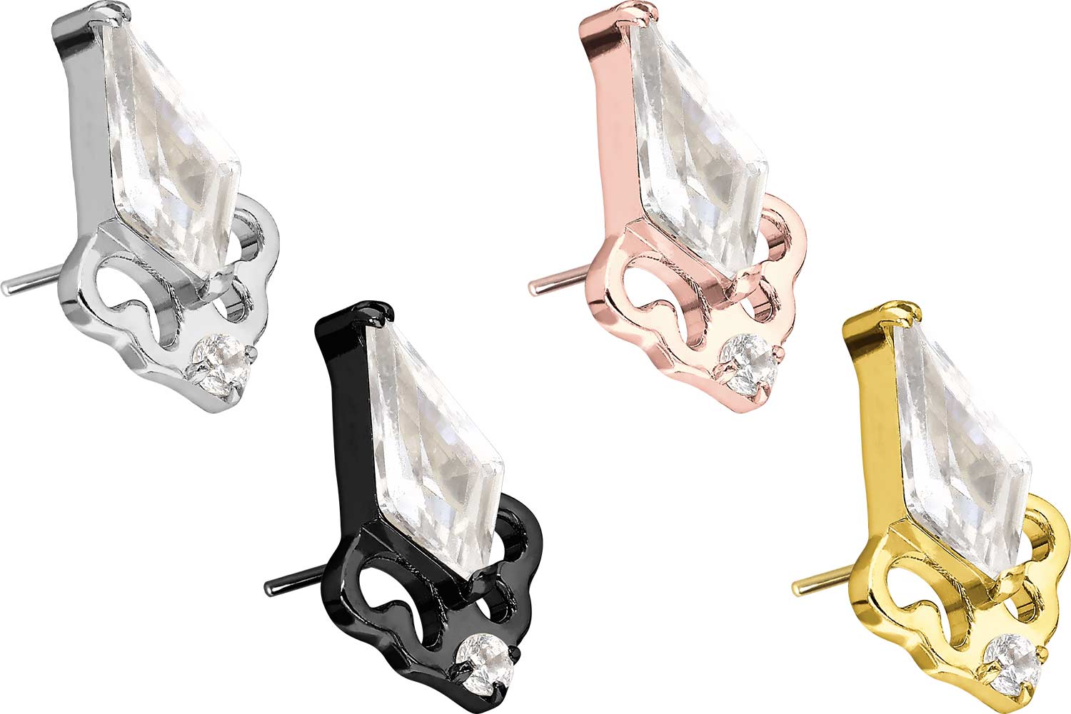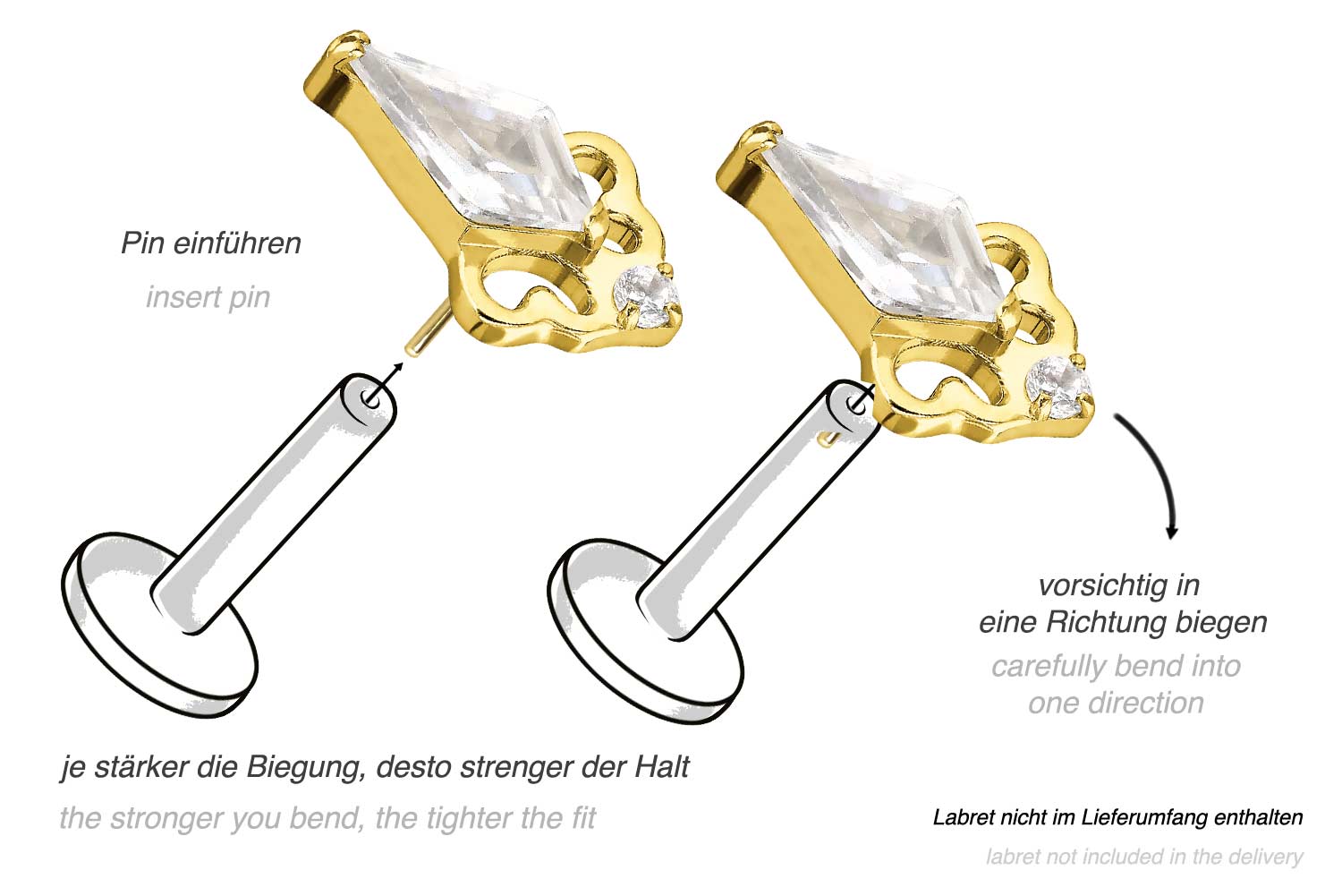 Dieser einzigartige Push Pin Aufsatz in Form eines Kristallschilds wurde speziell für unsere Push Fit Piercings entwickelt und besteht aus hochwertigem Titan, das sich unter anderem durch gute Hautverträglichkeit und hohe Beständigkeit auszeichnet. Ebenfalls zu seinen spezifischen Materialeigenschaften gehört Farbechtheit, die sowohl bei der silberfarbenen als auch bei der schwarzen, gold- und roségoldfarbenen Variante mit PVD-Beschichtung gewährleistet wird. Zum Einsetzen muss der Pin nach Belieben gebogen werden. Es ist zu beachten, dass ein festerer Halt gewährleistet ist, wenn der Pin ein bisschen stärker gebogen wird. Darüber hinaus ist der Push Pin des Aufsatzes mit all unseren Push Fit Produkten kompatibel, sodass sich vielfältige Kombinationsmöglichkeiten ergeben.