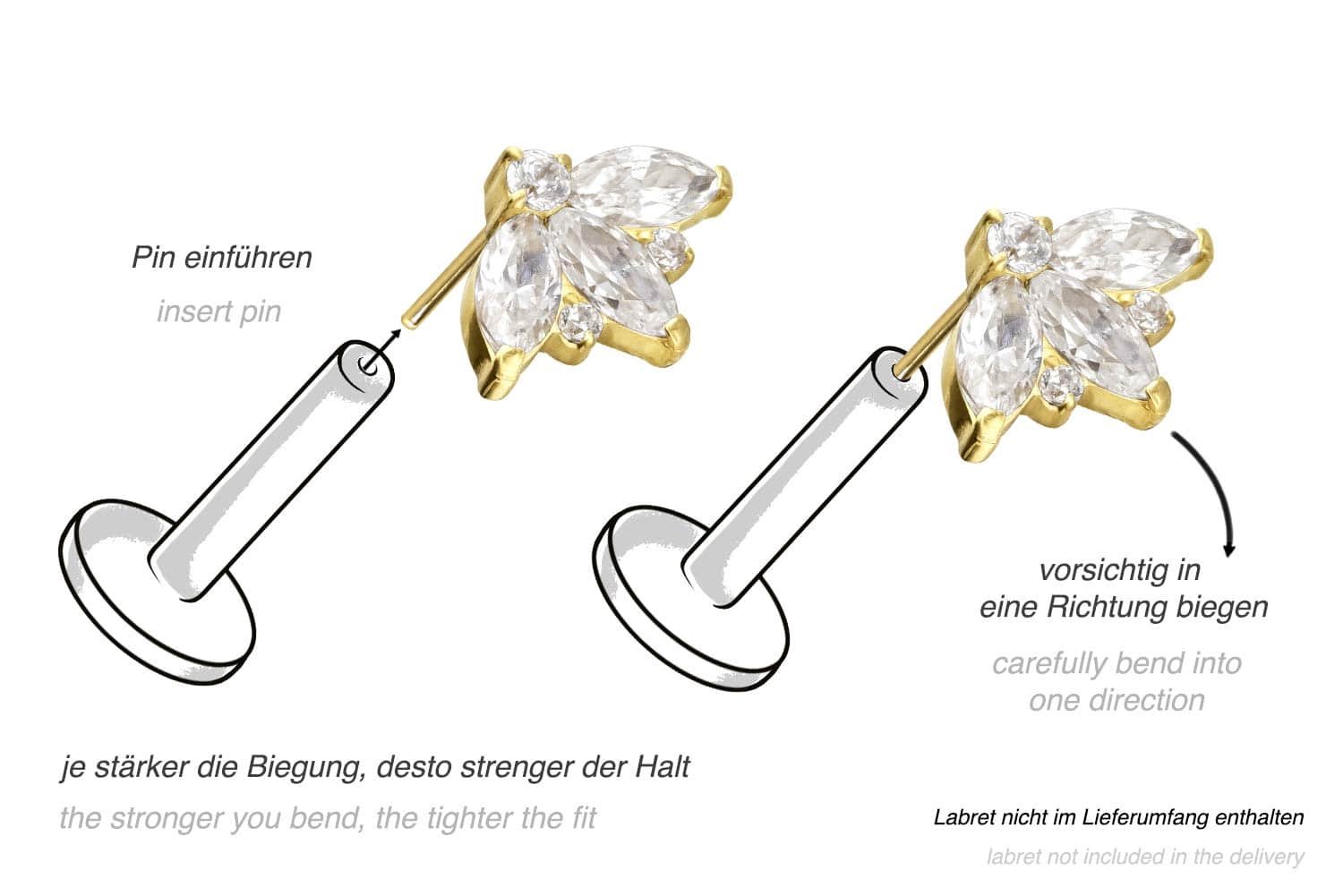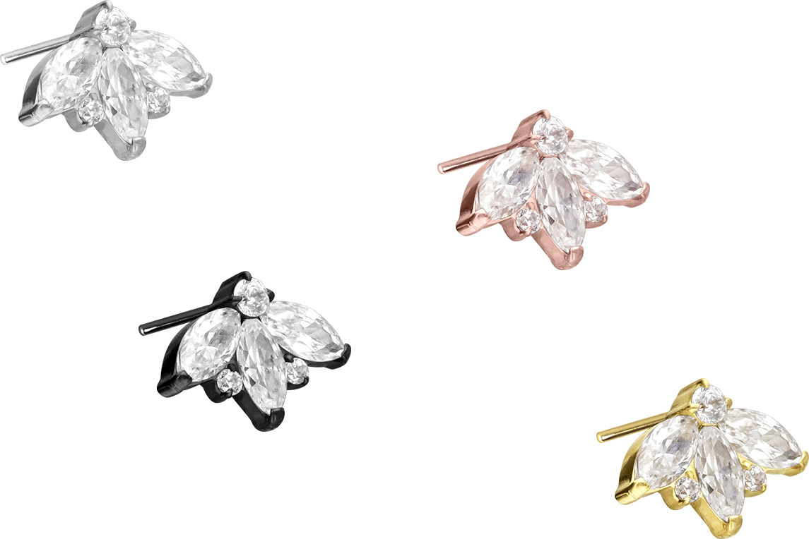Dieser einzigartige Push Pin Aufsatz in Form einer funkelnden Lotusblüte wurde speziell für unsere Push Fit Piercings entwickelt und besteht aus hochwertigem Titan, das sich unter anderem