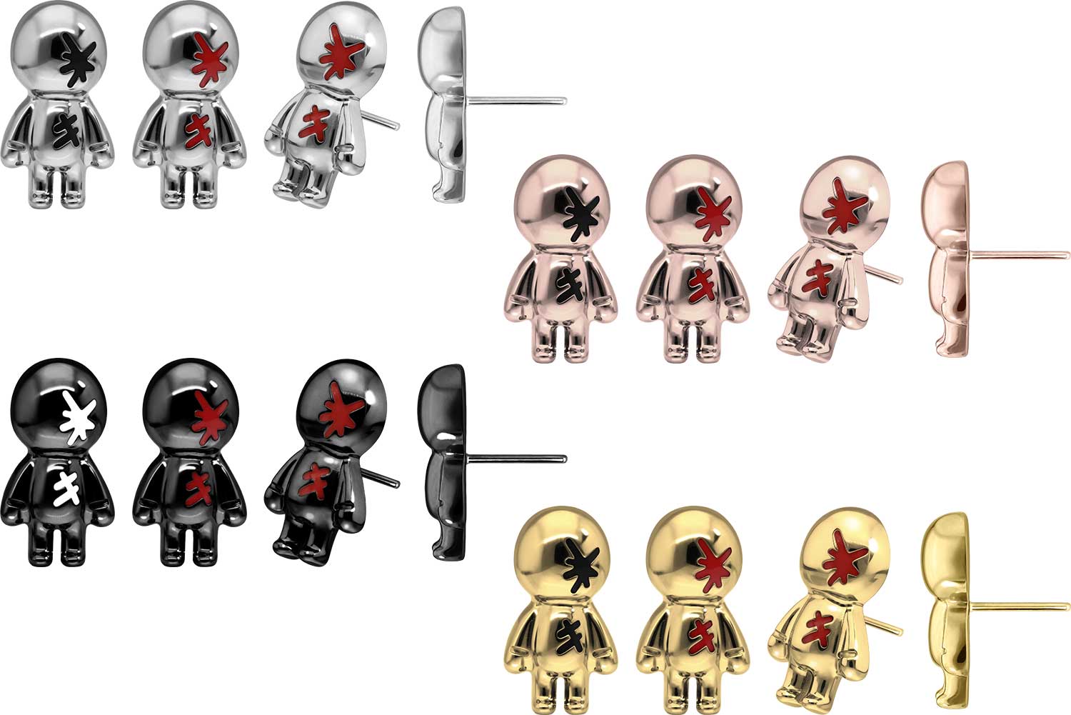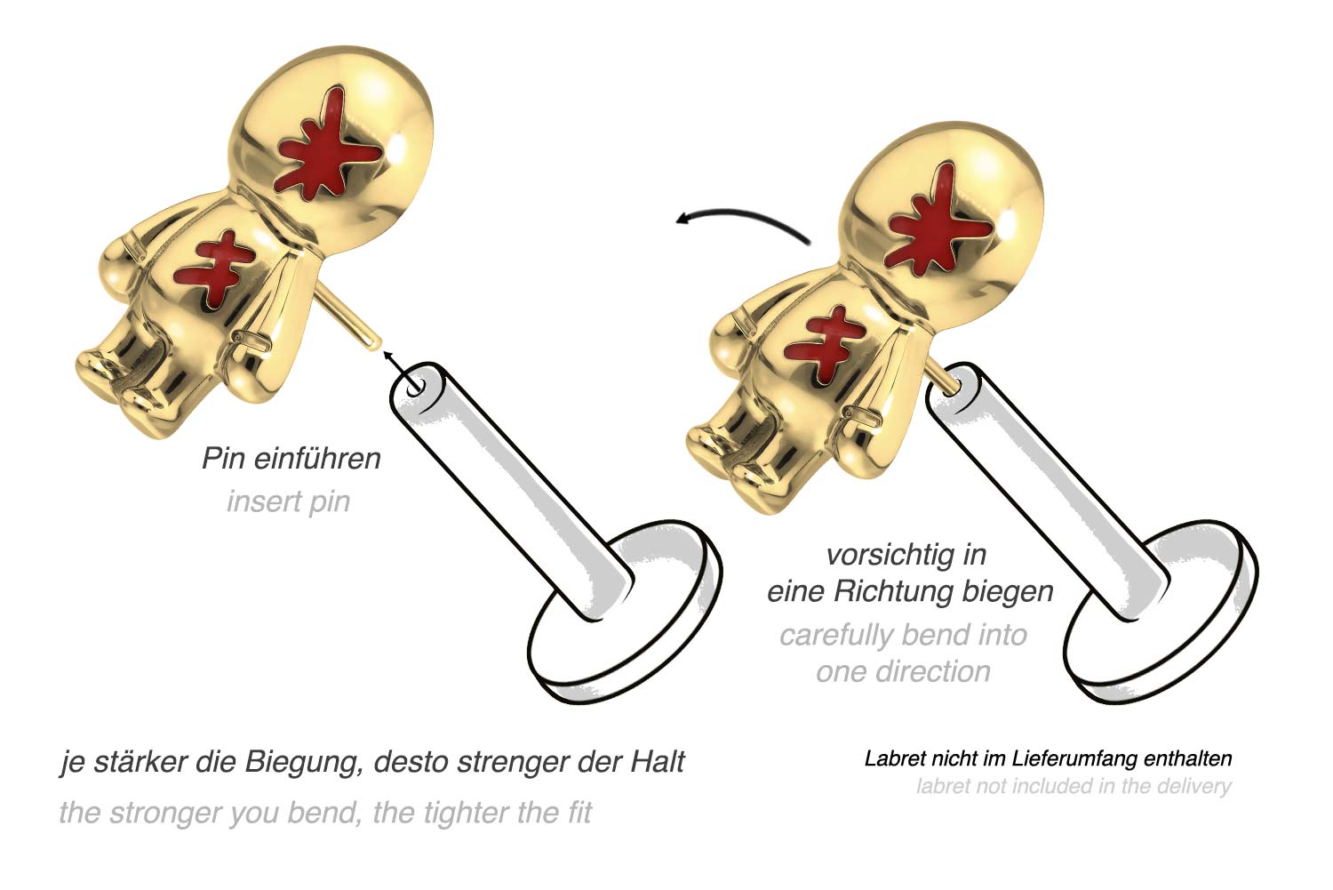 Dieser einzigartige Push Pin Aufsatz in Form eines Puppe wurde speziell für unsere Push Fit Piercings entwickelt und besteht aus hochwertigem Titan, das sich unter anderem durch gute Hautverträglichkeit und hohe Beständigkeit auszeichnet. Ebenfalls zu seinen spezifischen Materialeigenschaften gehört Farbechtheit, die sowohl bei der silberfarbenen als auch bei der schwarzen, gold- und roségoldfarbenen Variante mit PVD-Beschichtung gewährleistet wird. Zum Einsetzen muss der Pin nach Belieben gebogen werden. Es ist zu beachten, dass ein festerer Halt gewährleistet ist, wenn der Pin ein bisschen stärker gebogen wird. Darüber hinaus ist der Push Pin des Aufsatzes mit all unseren Push Fit Produkten kompatibel, sodass sich vielfältige Kombinationsmöglichkeiten ergeben.