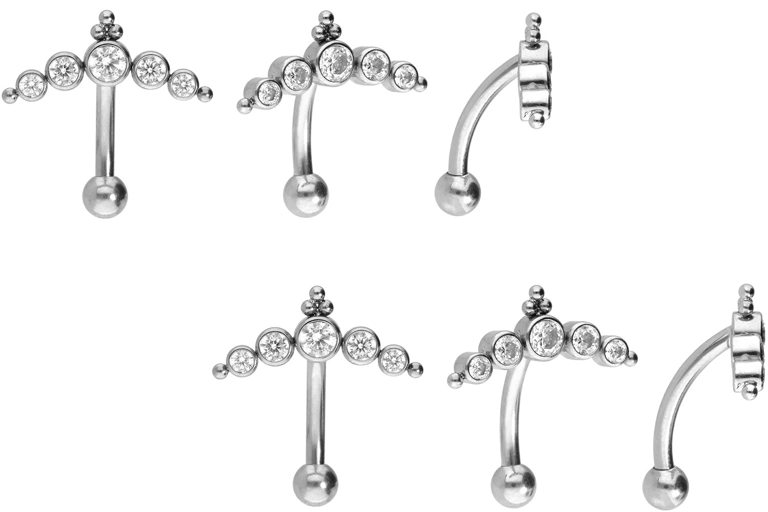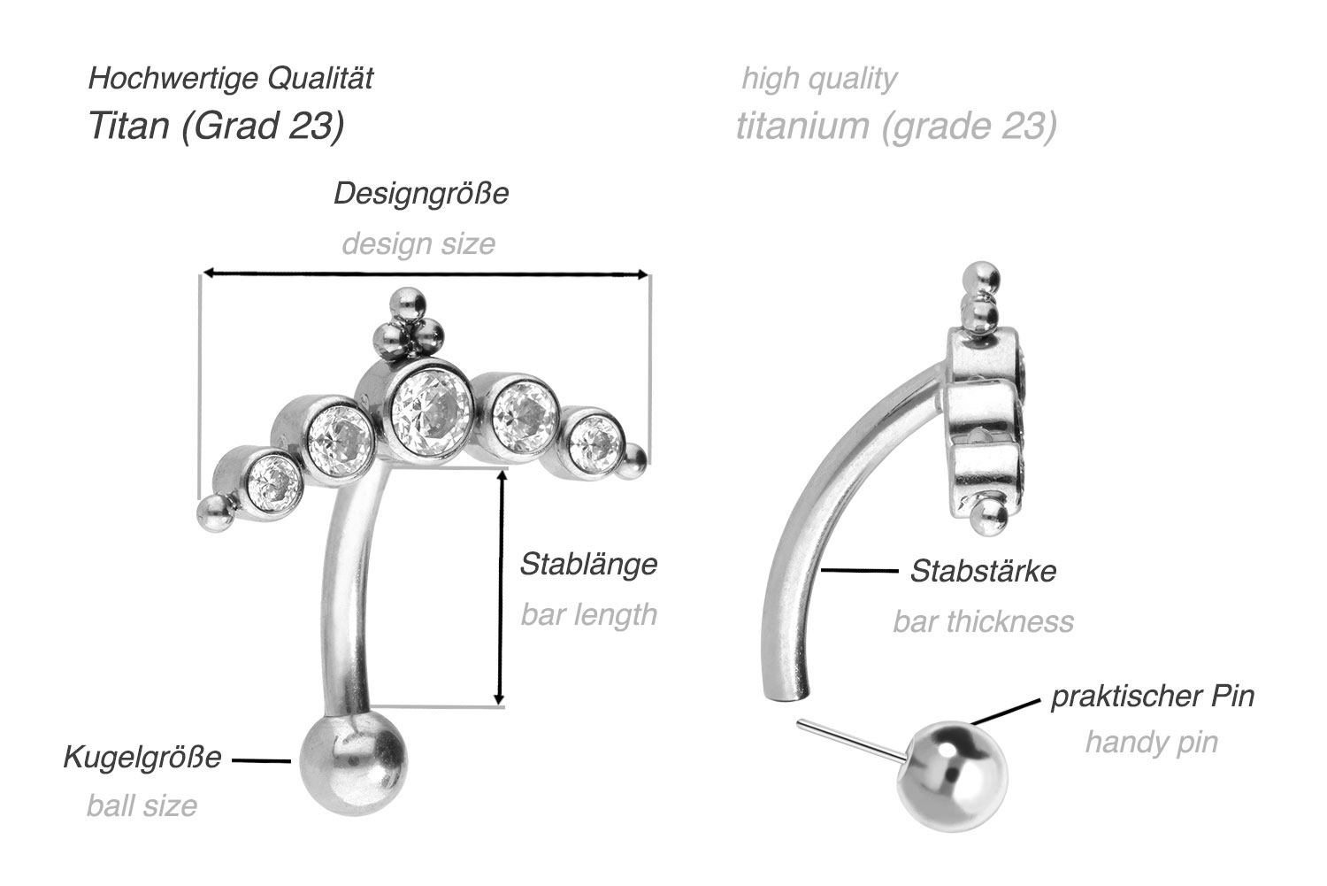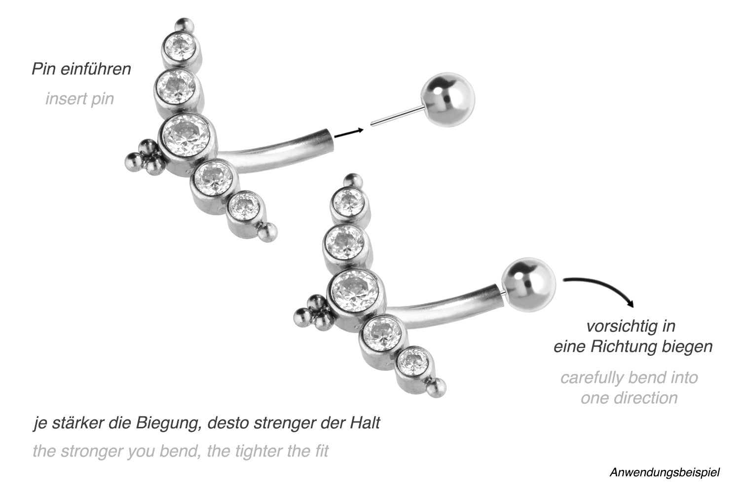 hohe Beständigkeit bekannt ist. Seine Kugel ist mittels Push Pin am Schmuckstück angebracht, während das auf der gegenüberliegenden Seite befindliche Design mit fünf funkelnden Kristallen umrahmt von ein paar Kugeln fest mit dem Stab verbunden ist. Durch die verwendete Push Fit Technologie kann die Banane nach Belieben mit all unseren Aufsätzen mit Push Pin kombiniert werden.