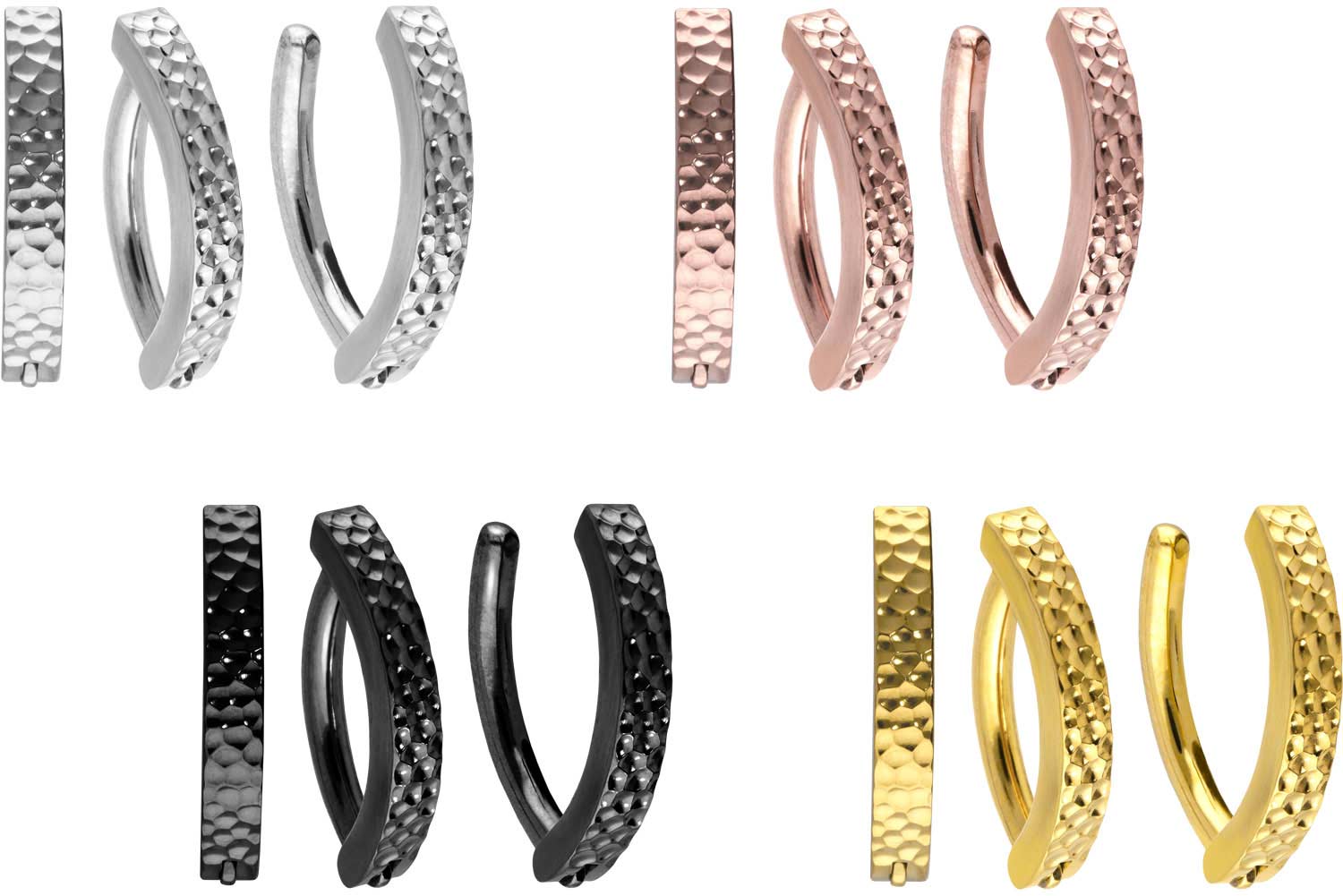 das Piercing mit einer kratzfesten PVD-Beschichtung überzogen. Ebenso schlicht wie elegant ist der Bogen mit der gehämmerten Struktur, die das Design ausmacht. Dieser Bauchnabelclicker verfügt über eine Stabstärke von 1,6 mm und eine Stablänge von 10 mm.