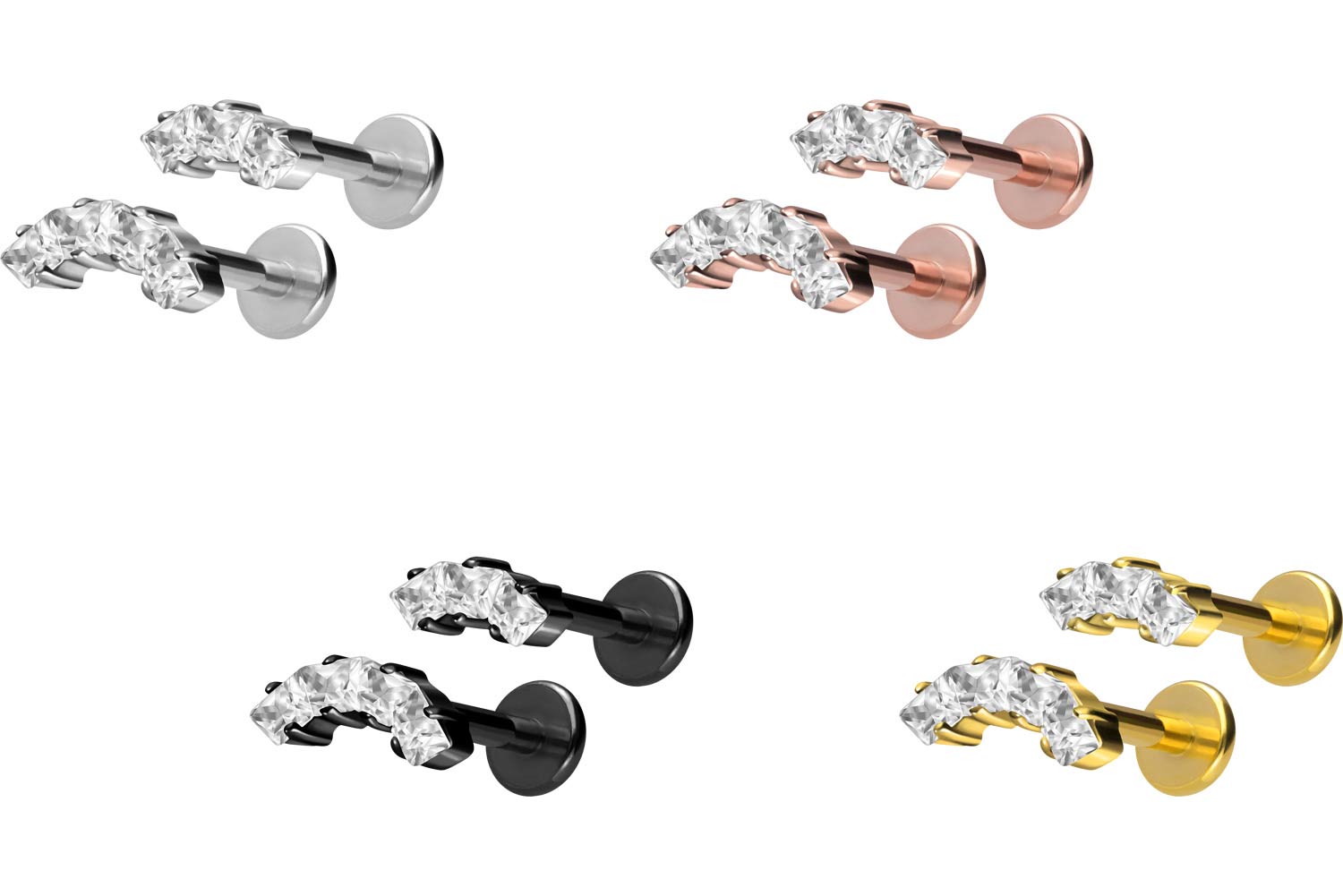 Dieses einzigartige Labret ist aus hochwertigem Titan gefertigt, das auch für Materialeigenschaften wie besonders gute Hautverträglichkeit und hohe Beständigkeit bekannt ist. Ebenfalls zu seinen Vorzügen gehört Farbechtheit, die auch bei den farbigen Varianten mit PVD-Beschichtung gewährleistet wird. Das Labret verfügt über einen zeitlos schönen Schraubaufsatz mit Außengewinde in Form mehrerer funkelnder Kristalltrapeze mit Fassungen, hat  eine Stabstärke von entweder 1,2 oder 1,6 mm und ist in den unten aufgeführten Stablängen erhältlich. Darüber hinaus kann sein 0,9 mm Innengewinde nach Belieben mit all unseren anderen Schraubaufsätzen mit entsprechendem Außengewinde kombiniert werden.