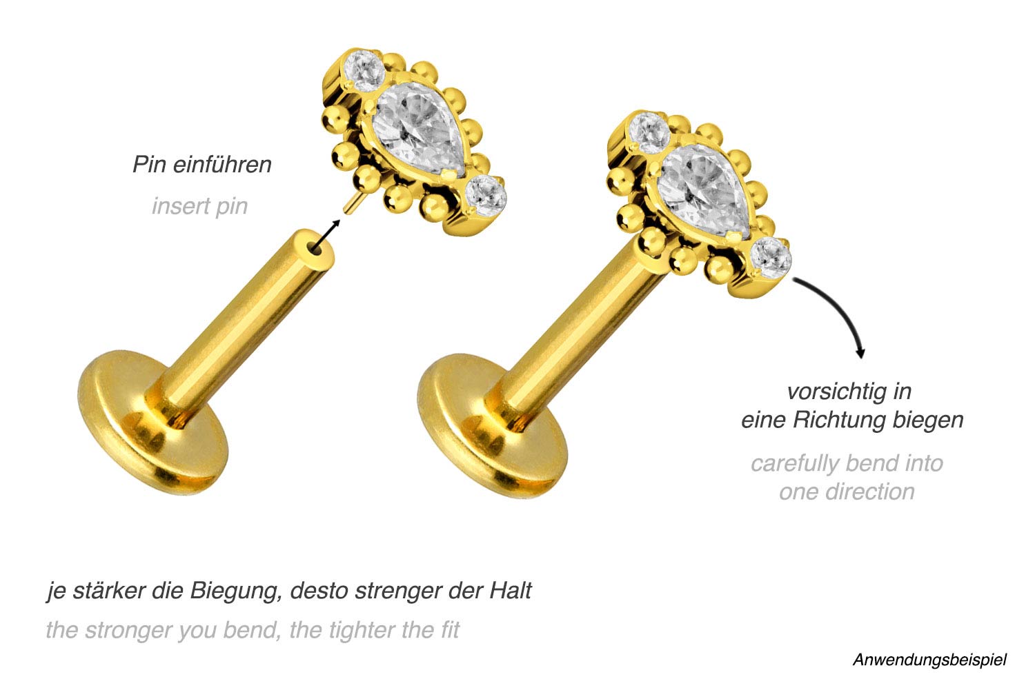 Durch die verwendete Push Fit Technologie kann das Labret nach Belieben mit all unseren Aufsätzen mit Push Pin kombiniert werden.