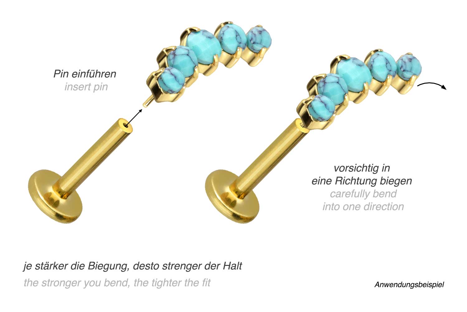 Durch die verwendete Push Fit Technologie kann das Labret nach Belieben mit all unseren Aufsätzen mit Push Pin kombiniert werden.