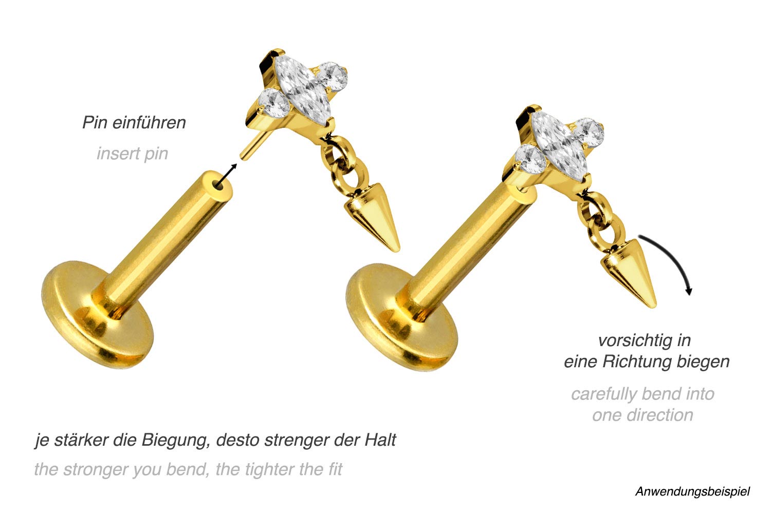 Durch die verwendete Push Fit Technologie kann das Labret nach Belieben mit all unseren Aufsätzen mit Push Pin kombiniert werden.