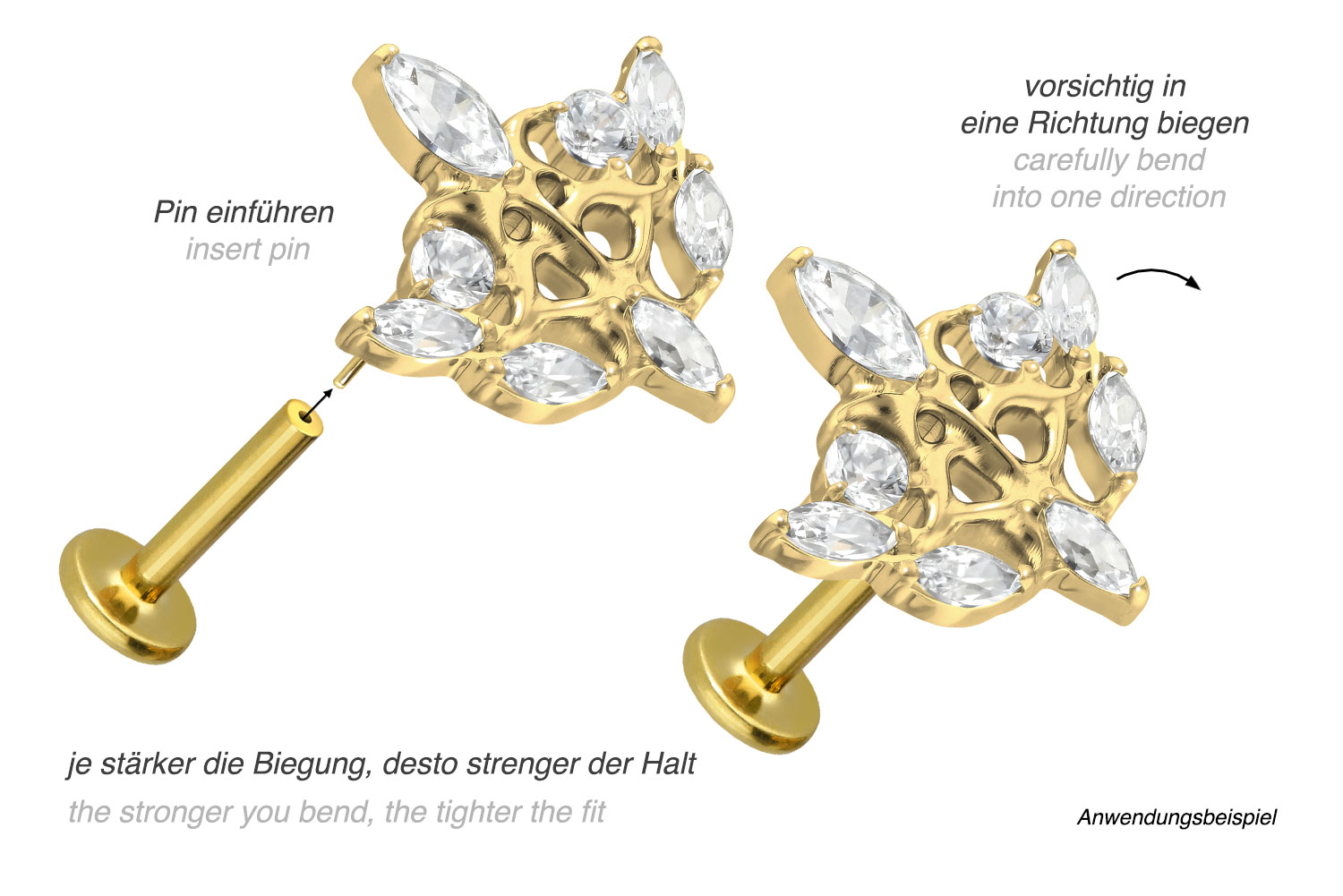 Durch die verwendete Push Fit Technologie kann das Labret nach Belieben mit all unseren Aufsätzen mit Push Pin kombiniert werden.