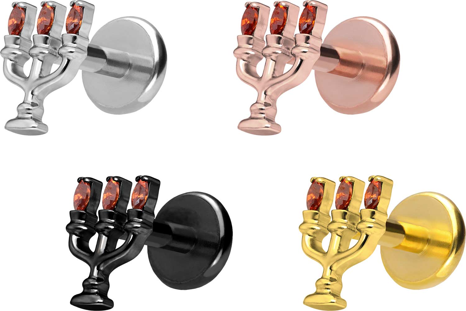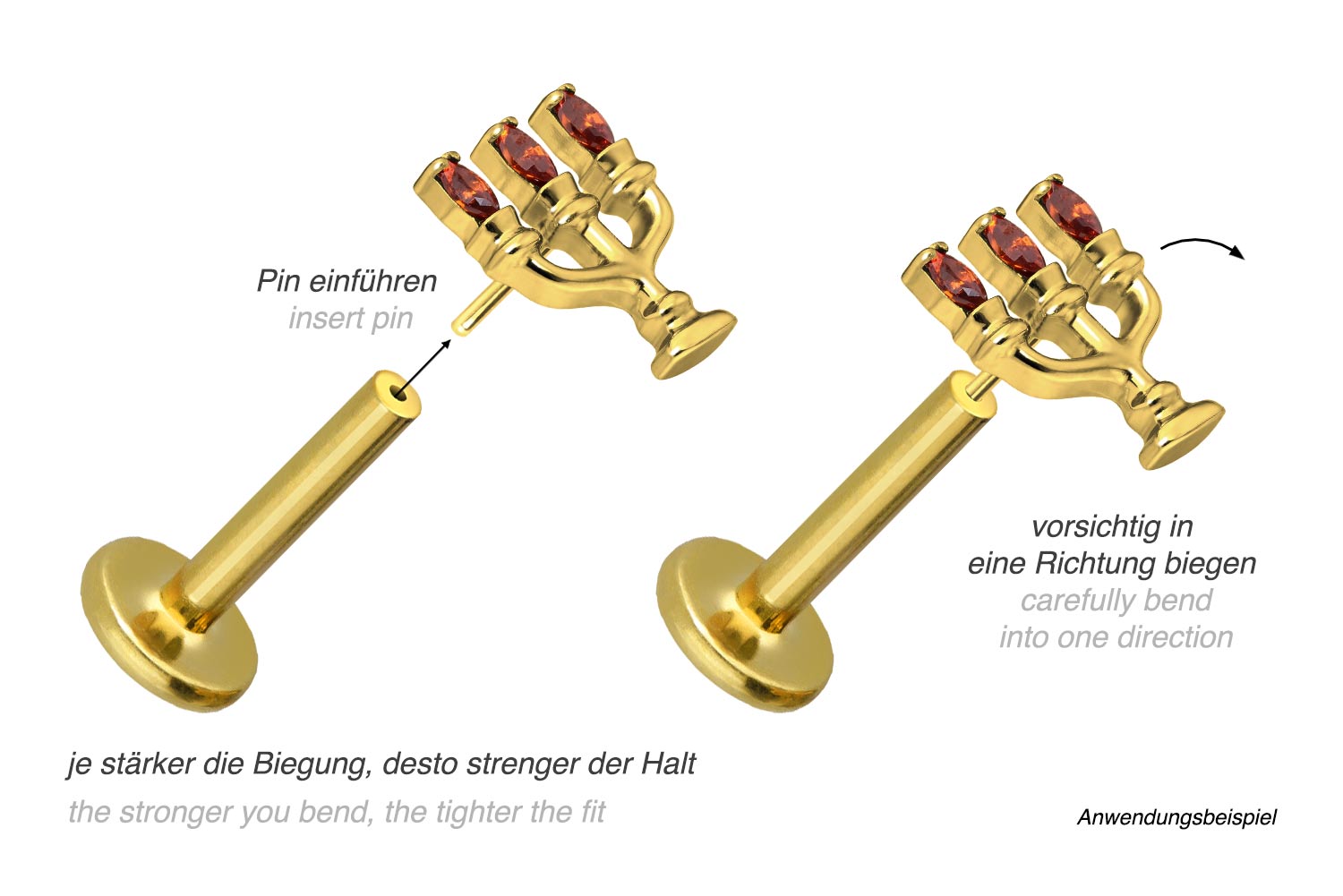 Dieses einzigartige Labret ist aus hochwertigem Titan gefertigt, das auch für Materialeigenschaften wie besonders gute Hautverträglichkeit und hohe Beständigkeit bekannt ist. Ebenfalls zu seinen Vorzügen gehört Farbechtheit, die auch bei den farbigen Varianten mit PVD-Beschichtung gewährleistet wird. Das Labret verfügt über einen zeitlos schönen Aufsatz mit Push Pin in Form eines Kerzenleuchters, hat eine Stabstärke von entweder 1 oder 1,2 mm und ist in den unten aufgeführten Stablängen erhältlich. Durch die verwendete Push Fit Technologie kann das Labret nach Belieben mit all unseren Aufsätzen mit Push Pin kombiniert werden.