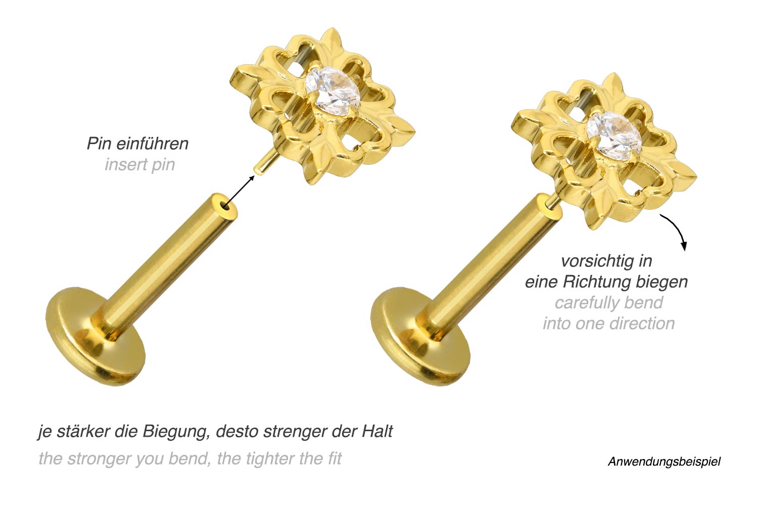 Durch die verwendete Push Fit Technologie kann das Labret nach Belieben mit all unseren Aufsätzen mit Push Pin kombiniert werden.