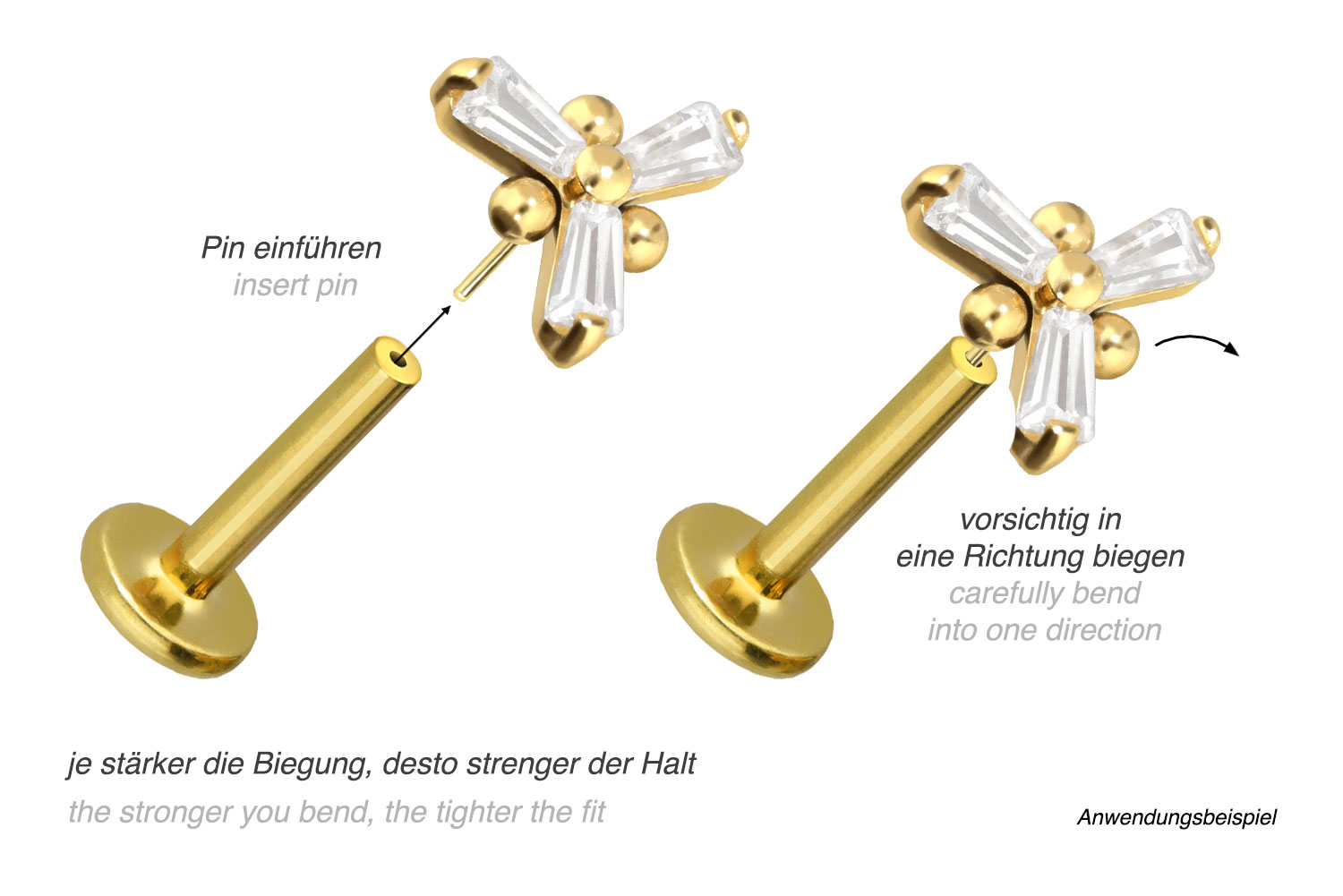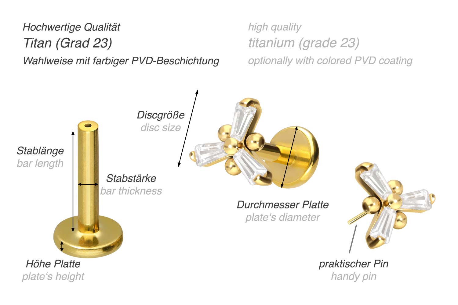 Dieses einzigartige Labret ist aus hochwertigem Titan gefertigt, das auch für Materialeigenschaften wie besonders gute Hautverträglichkeit und hohe Beständigkeit bekannt ist. Ebenfalls zu seinen Vorzügen gehört Farbechtheit, die auch bei den farbigen Varianten mit PVD-Beschichtung gewährleistet wird. Das Labret verfügt über einen zeitlos schönen Aufsatz mit Push Pin in Form einer Kristallblume, hat eine Stabstärke von entweder 1 oder 1,2 mm und ist in den unten aufgeführten Stablängen erhältlich. Durch die verwendete Push Fit Technologie kann das Labret nach Belieben mit all unseren Aufsätzen mit Push Pin kombiniert werden.