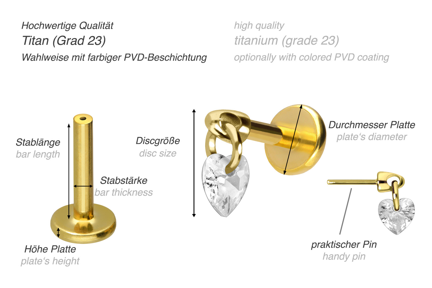 Dieses einzigartige Labret ist aus hochwertigem Titan gefertigt, das auch für Materialeigenschaften wie besonders gute Hautverträglichkeit und hohe Beständigkeit bekannt ist. Ebenfalls zu seinen Vorzügen gehört Farbechtheit, die auch bei den farbigen Varianten mit PVD-Beschichtung gewährleistet wird. Das Labret verfügt über einen zeitlos schönen Aufsatz mit Push Pin in Form eines funkelnden Herzens, hat eine Stabstärke von entweder 1 oder 1,2 mm und ist in den unten aufgeführten Stablängen erhältlich. Durch die verwendete Push Fit Technologie kann das Labret nach Belieben mit all unseren Aufsätzen mit Push Pin kombiniert werden.
