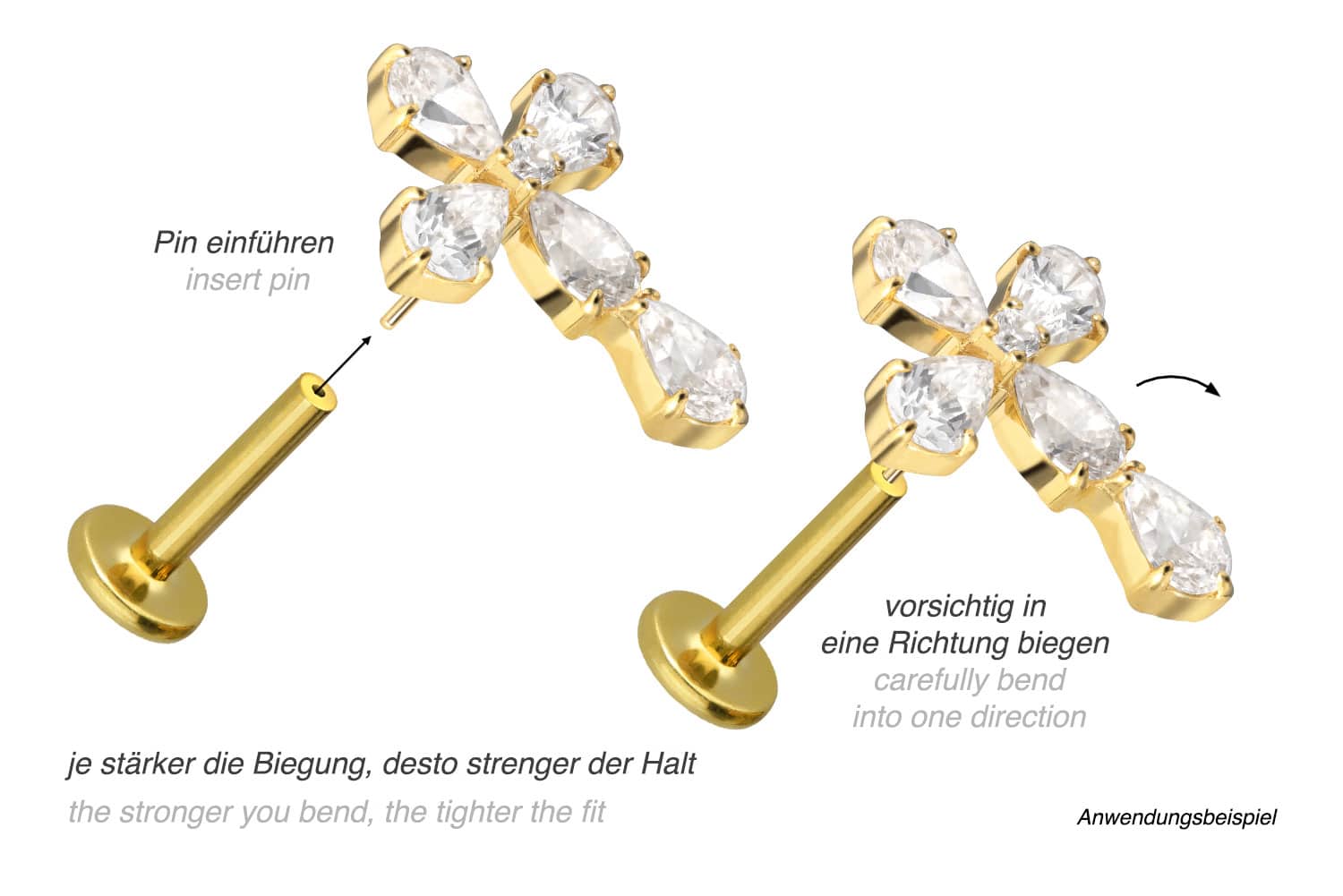 zeitlos schönen Aufsatz mit Push Pin in Form eines Kristallkreuzes, hat eine Stabstärke von entweder 1 oder 1,2 mm