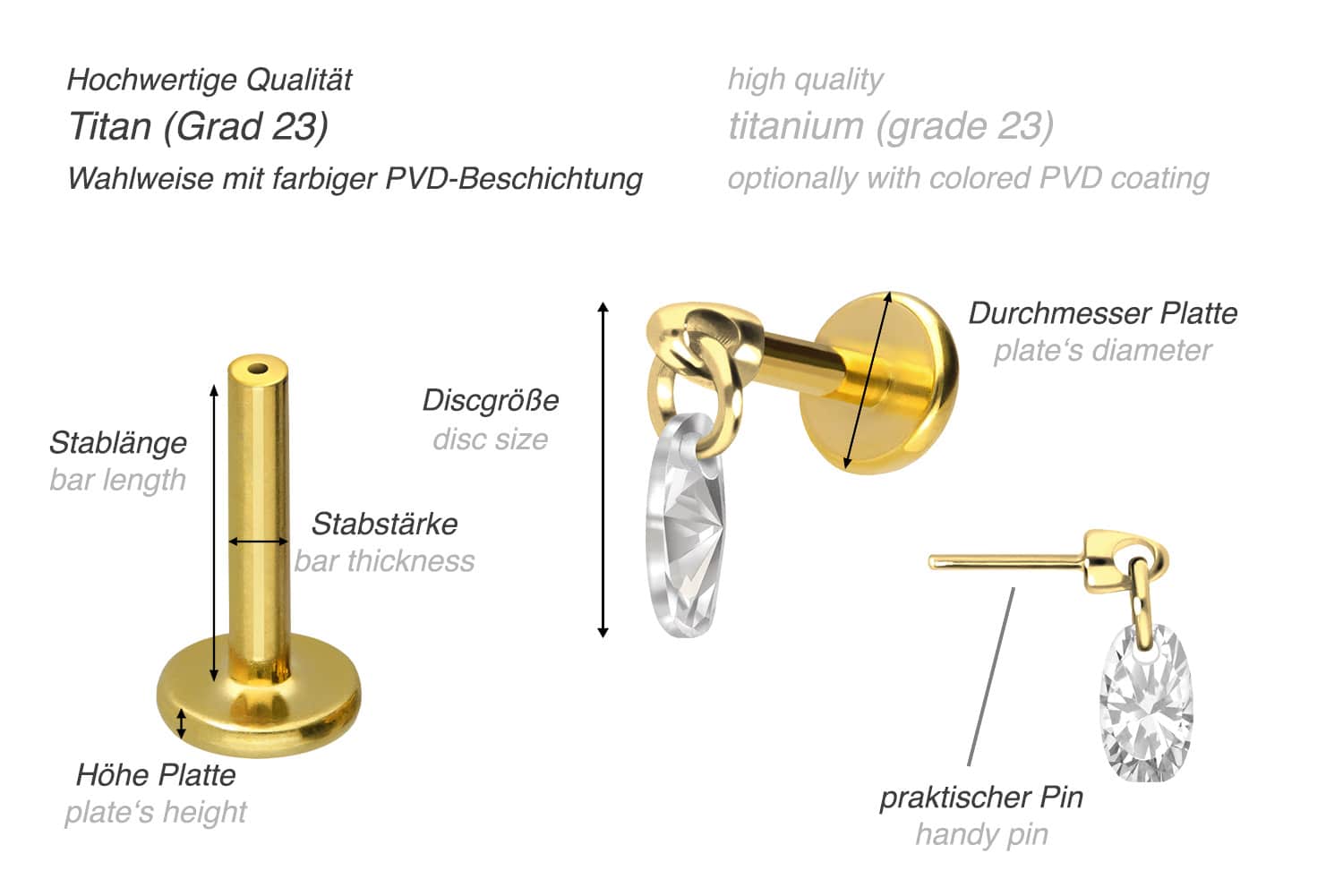 Dieses einzigartige Labret ist aus hochwertigem Titan gefertigt, das auch für Materialeigenschaften wie besonders gute Hautverträglichkeit und hohe Beständigkeit bekannt ist. Ebenfalls zu seinen Vorzügen gehört Farbechtheit, die auch bei den farbigen Varianten mit PVD-Beschichtung gewährleistet wird. Das Labret verfügt über einen zeitlos schönen Aufsatz mit Push Pin in Form eines funkelnden Ovals, hat eine Stabstärke von entweder 1 oder 1,2 mm und ist in den unten aufgeführten Stablängen erhältlich. Durch die verwendete Push Fit Technologie kann das Labret nach Belieben mit all unseren Aufsätzen mit Push Pin kombiniert werden.