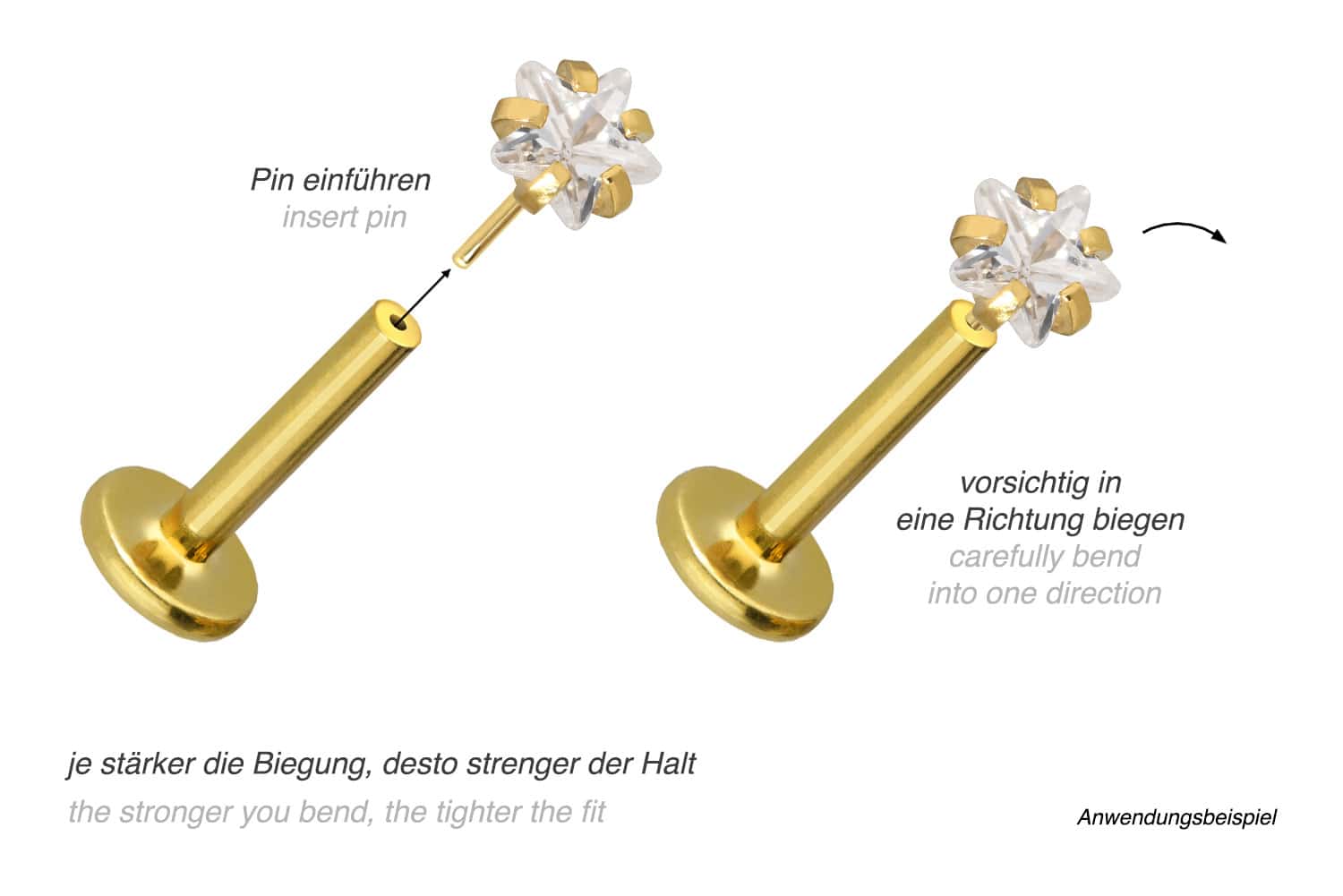 Durch die verwendete Push Fit Technologie kann das Labret nach Belieben mit all unseren Aufsätzen mit Push Pin kombiniert werden.