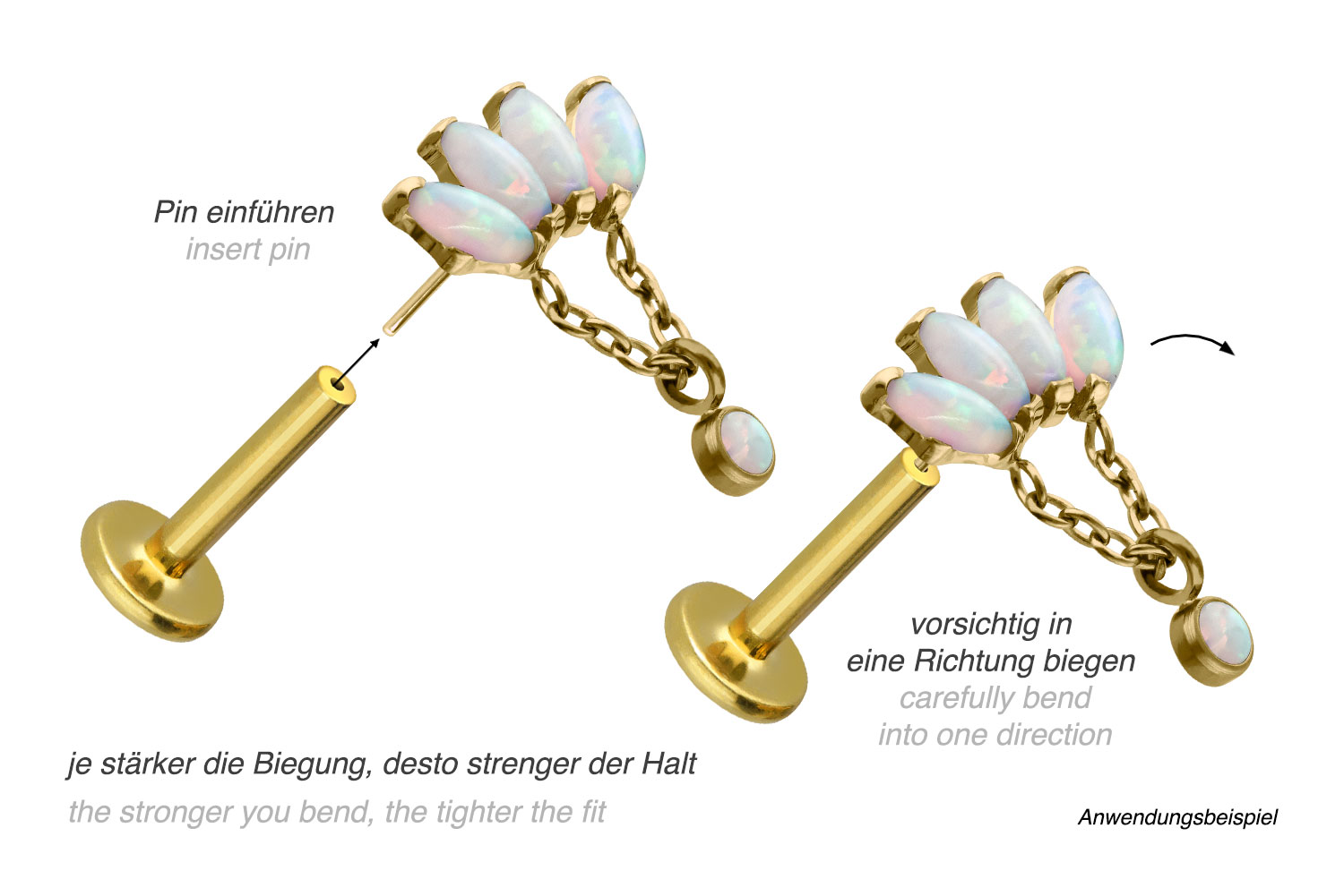 Durch die verwendete Push Fit Technologie kann das Labret nach Belieben mit all unseren Aufsätzen mit Push Pin kombiniert werden.