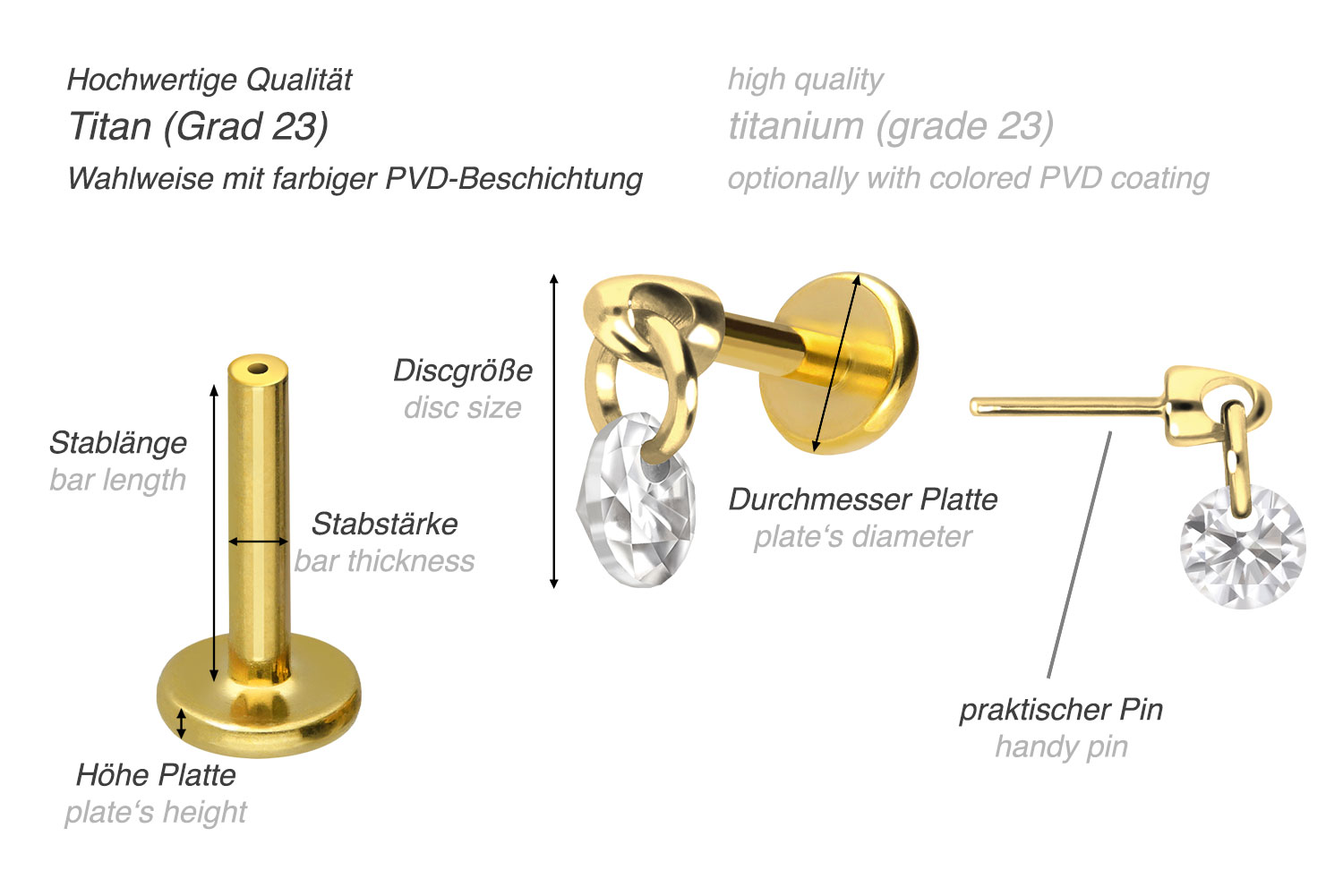 Dieses einzigartige Labret ist aus hochwertigem Titan gefertigt, das auch für Materialeigenschaften wie besonders gute Hautverträglichkeit und hohe Beständigkeit bekannt ist. Ebenfalls zu seinen Vorzügen gehört Farbechtheit, die auch bei den farbigen Varianten mit PVD-Beschichtung gewährleistet wird. Das Labret verfügt über einen zeitlos schönen Aufsatz mit Push Pin in Form eines runden Kristalls, hat eine Stabstärke von entweder 1 oder 1,2 mm und ist in den unten aufgeführten Stablängen erhältlich. Durch die verwendete Push Fit Technologie kann das Labret nach Belieben mit all unseren Aufsätzen mit Push Pin kombiniert werden.