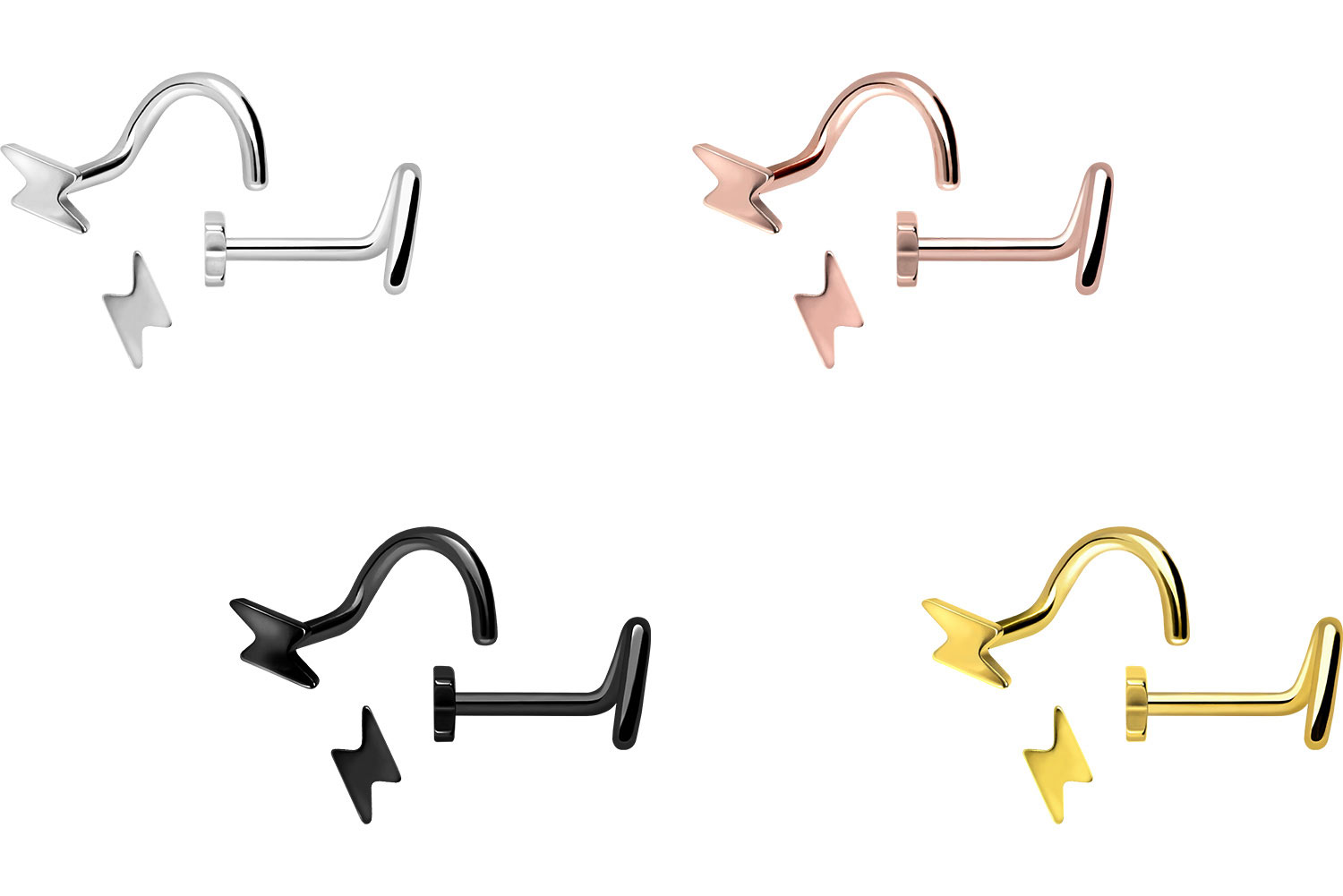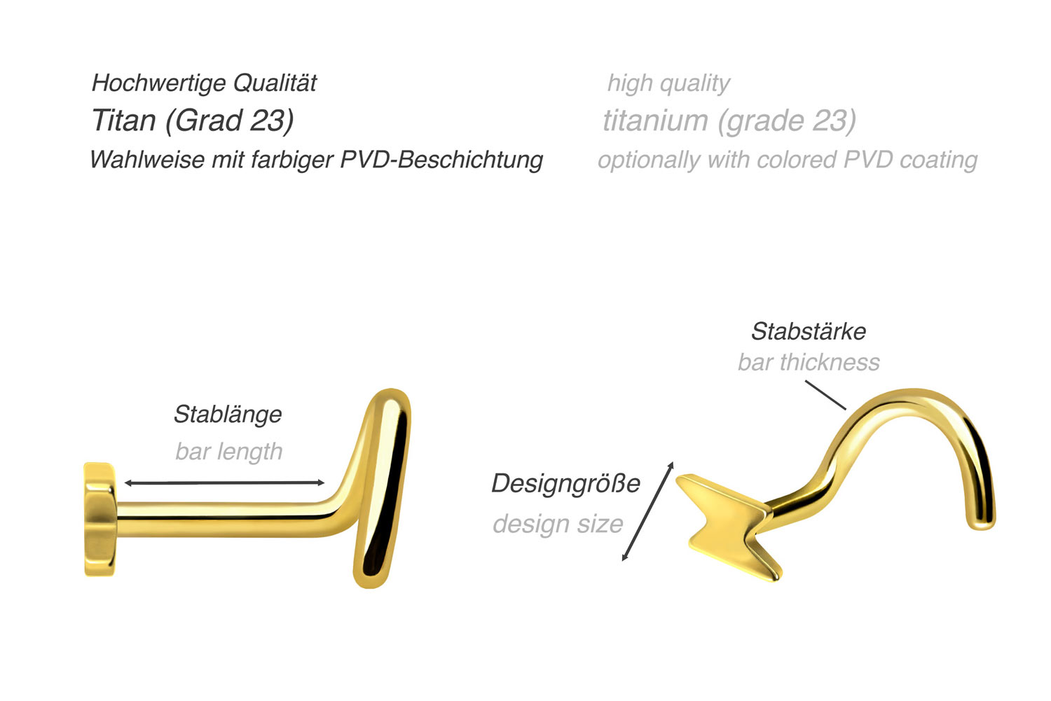 Dieser stilvolle Nasenstecker ist aus hochwertigem Titan gefertigt, das je nach gewünschter Farbe mit einer kratzfesten PVD-Beschichtung überzogen ist. Zu den Materialeigenschaften von Titan gehören neben der hohen Qualität auch gute Hautverträglichkeit und Beständigkeit. Ein besserer Halt in der Nase wird durch die Spiralform gewährleistet. Als besonderes Highlight ziert das wunderschöne Schmuckstück ein Blitz. Der Nasenstecker verfügt darüber hinaus über eine Stabstärke von 0,8 mm und eine Stablänge von 6,5 mm.