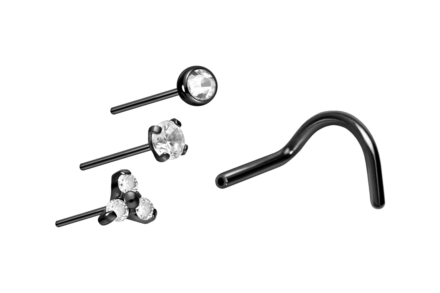 hohe Beständigkeit bekannt ist. Ebenfalls zu seinen Vorzügen gehört Farbechtheit, die auch bei den farbigen Varianten mit PVD-Beschichtung gewährleistet wird. Das Schmuckstück wird mit drei zeitlos schönen Push Pin Aufsätzen geliefert, hat eine Stabstärke von 0,8 mm und ist mit einer Stablänge von 6 mm erhältlich. Seine Spiralform gewährleistet zudem einen besseren Halt in der Nase. Durch die verwendete Push Fit Technologie kann der Nasenstecker nach Belieben mit all unseren Aufsätzen mit Push Pin kombiniert werden.