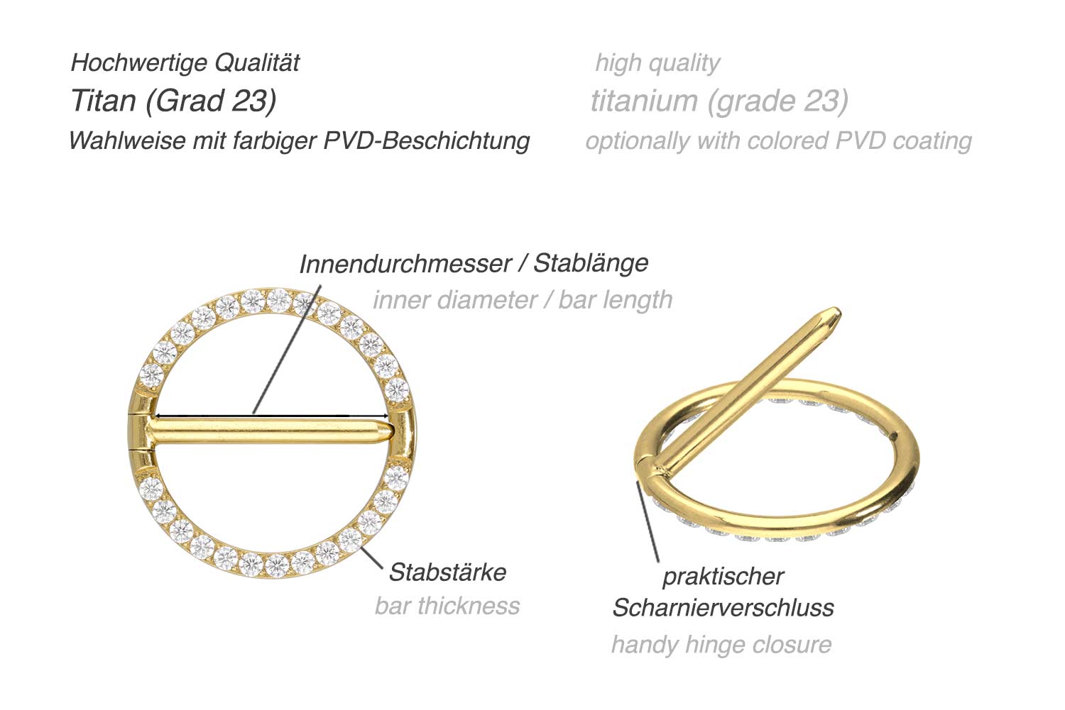Einfache Handhabung und schönes Design - das sind unsere Nippelpiercing Clicker! Als Hauptmerkmal der Clicker zählt das praktische Scharnier, das den Einsatz in den Stichkanal enorm erleichtert. Das zur Herstellung verwendete Material (Titan Grad 23) zeichnet sich insbesondere durch gute Hautverträglichkeit und hochwertige Qualität aus. Je nach Farbwunsch ist das Piercing mit einer kratzfesten PVD-Beschichtung überzogen. Viele glänzende Kristalle und ihre stilvolle Anordnung verleihen dem Schmuckstück einen Hauch von Eleganz. Darüber hinaus hat der Clicker eine Stabstärke von 1,6 mm und ist in den unten aufgeführten Innendurchmessern erhältlich.