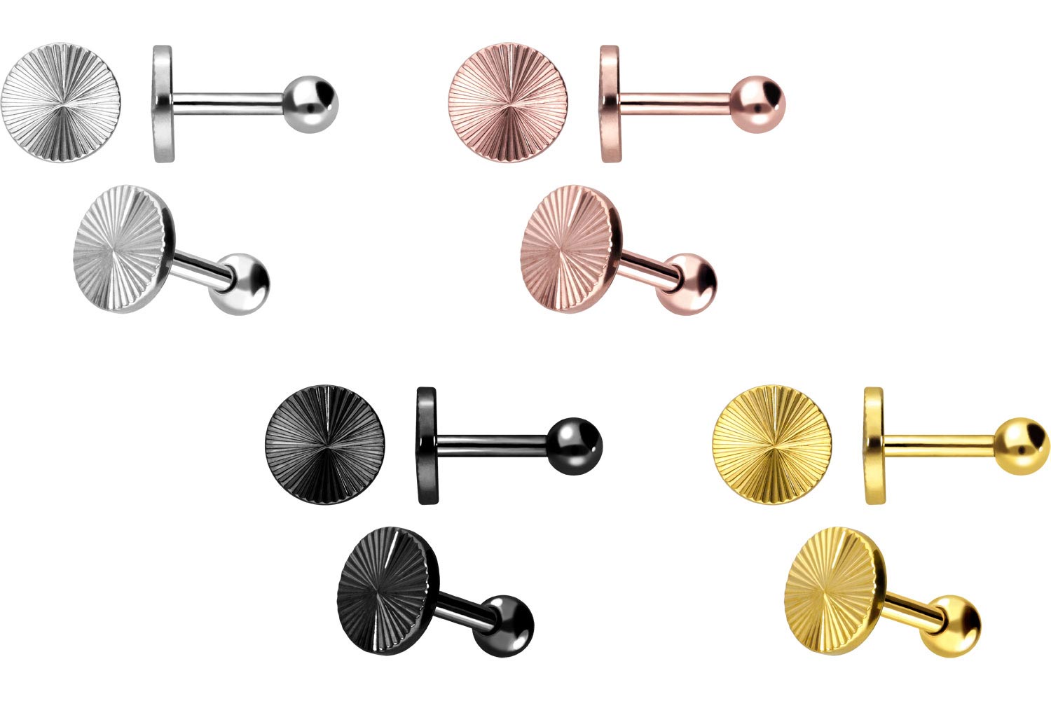 Dieses atemberaubend schöne Ohrpiercing besteht aus hochwertigem Titan, das bekanntermaßen über Materialeigenschaften wie gute Hautvertäglichkeit und hohe Beständigkeit verfügt. Im Falle der schwarzen, gold- und roségoldfarbenen Variante ist es mit einer kratzfesten PVD-Beschichtung überzogen. Visuell überzeugt das Schmuckstück mithilfe des strukturierten Designs. Erhältlich ist das Ohrpiercing mit einer Stabstärke von 1,2 mm und einer Stablänge von 6 mm.