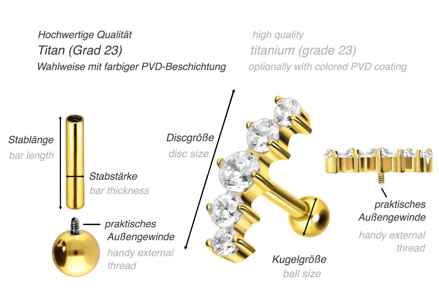 PVD-Beschichtung gewährleistet wird. Visuell überzeugt das Schmuckstück durch den zeitlos schönen Schraubaufsatz mit Außengewinde in Form von 5 funkelnden Kristallen mit Fassungen. Das Ohrpiercing hat eine Stabstärke von 1,2 mm und ist mit einer Stablänge von entweder 6 oder 8 mm erhältlich. Darüber hinaus können sowohl der Aufsatz als auch die hintere 3 mm Kugel durch das 0,9 mm Innengewinde nach Belieben durch all unsere anderen Schraubaufsätze mit entsprechendem Außengewinde ausgetauscht werden.