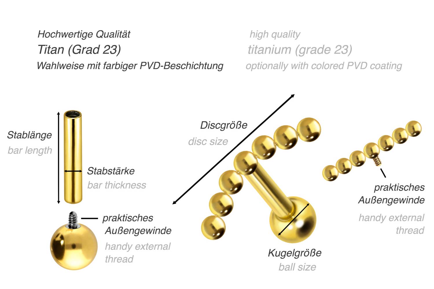 PVD-Beschichtung gewährleistet wird. Visuell überzeugt das Schmuckstück durch den zeitlos schönen Schraubaufsatz mit Außengewinde in Form von 7 Kugeln. Das Ohrpiercing hat eine Stabstärke von 1,2 mm und ist mit einer Stablänge von entweder 6 oder 8 mm erhältlich. Darüber hinaus können sowohl der Aufsatz als auch die hintere 3 mm Kugel durch das 0,9 mm Innengewinde nach Belieben durch all unsere anderen Schraubaufsätze mit entsprechendem Außengewinde ausgetauscht werden.