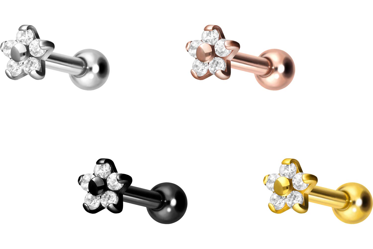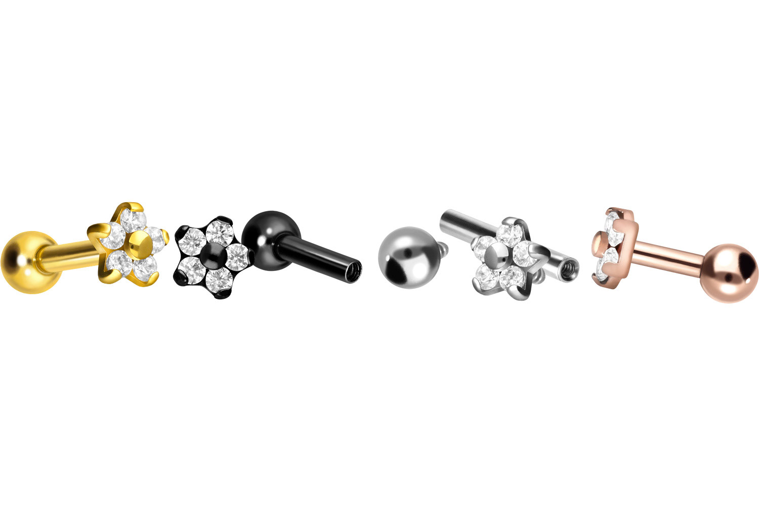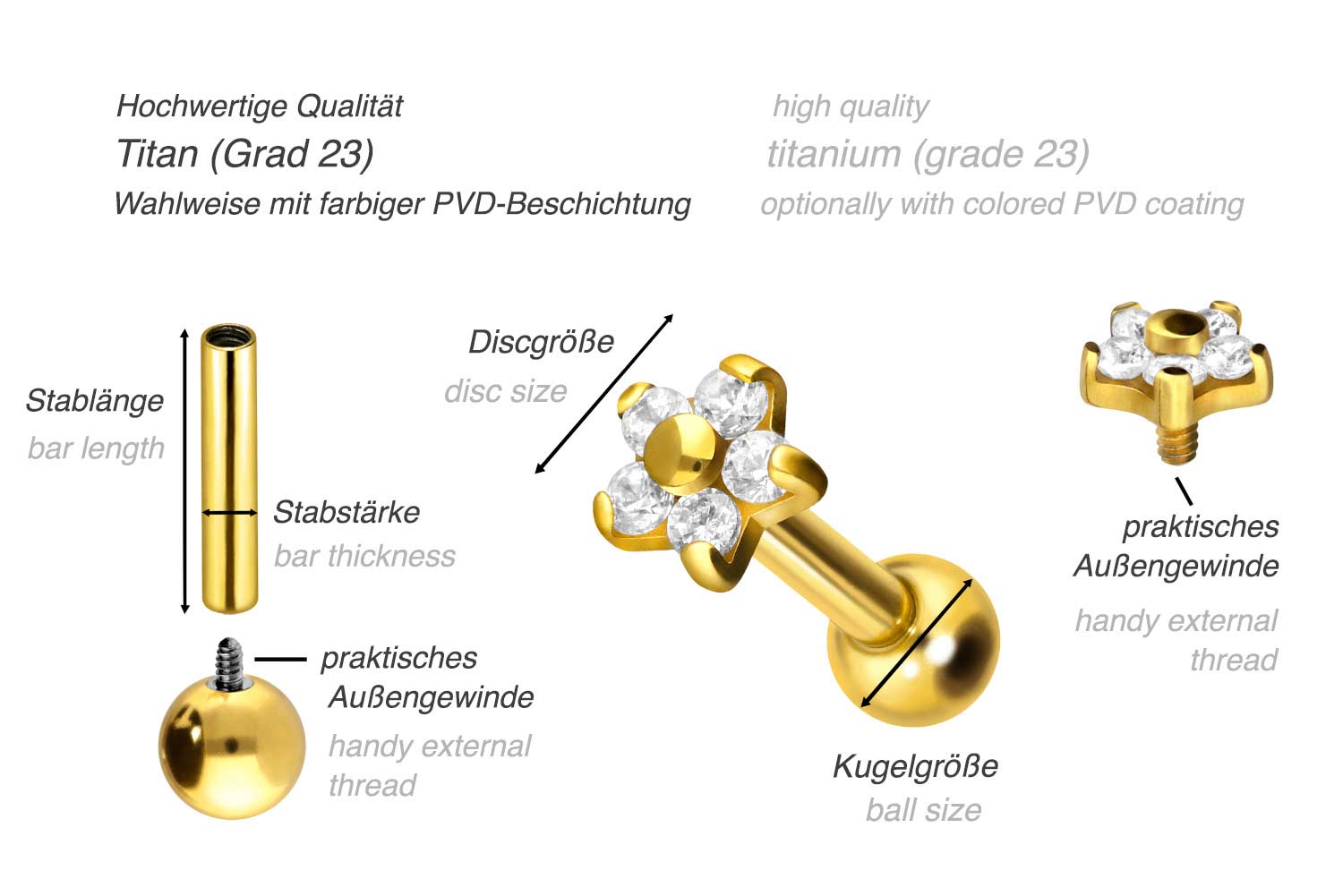 PVD-Beschichtung gewährleistet wird. Visuell überzeugt das Schmuckstück durch den zeitlos schönen Schraubaufsatz mit Außengewinde in Form einer funkelnden Kristallblume. Das Ohrpiercing hat eine Stabstärke von 1,2 mm und ist mit einer Stablänge von entweder 6 oder 8 mm erhältlich. Darüber hinaus können sowohl der Aufsatz als auch die hintere 3 mm Kugel durch das 0,9 mm Innengewinde nach Belieben durch all unsere anderen Schraubaufsätze mit entsprechendem Außengewinde ausgetauscht werden.
