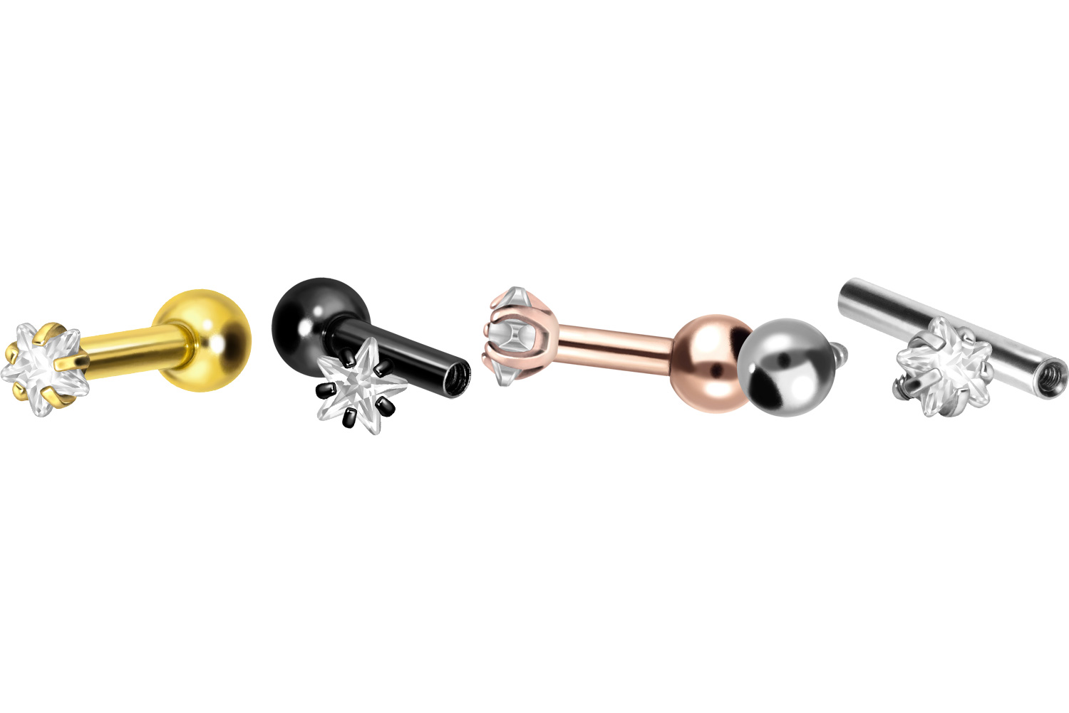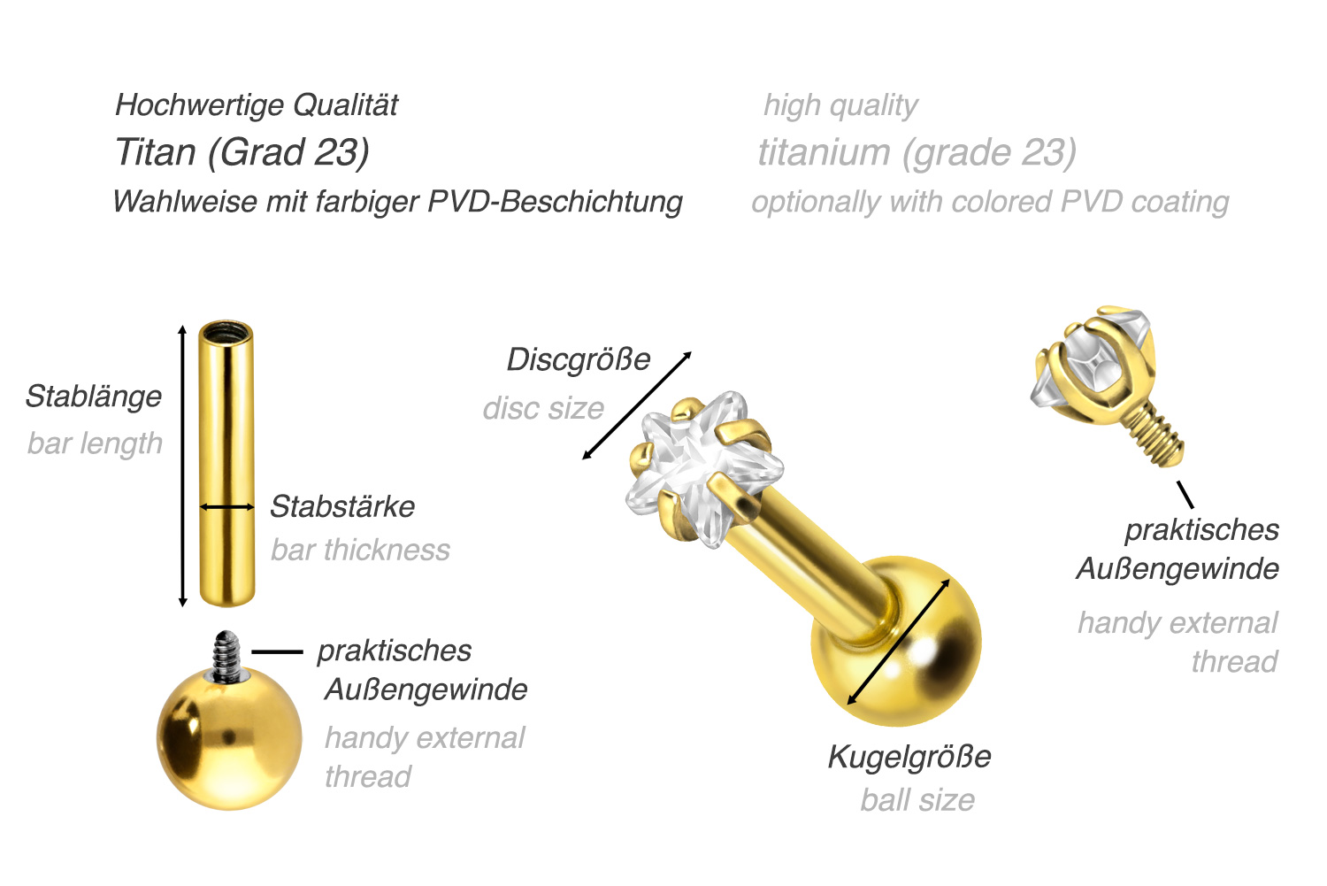 PVD-Beschichtung gewährleistet wird. Visuell überzeugt das Schmuckstück durch den zeitlos schönen Schraubaufsatz mit Außengewinde in Form eines funkelnden Kristallsterns mit Fassungen. Das Ohrpiercing hat eine Stabstärke von 1,2 mm und ist mit einer Stablänge von entweder 6 oder 8 mm erhältlich. Darüber hinaus können sowohl der Aufsatz als auch die hintere 3 mm Kugel durch das 0,9 mm Innengewinde nach Belieben durch all unsere anderen Schraubaufsätze mit entsprechendem Außengewinde ausgetauscht werden.