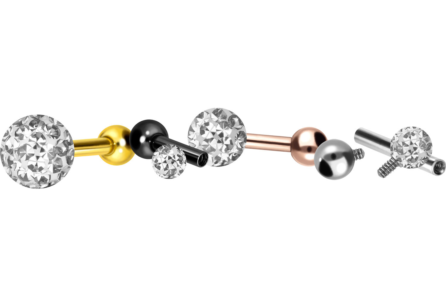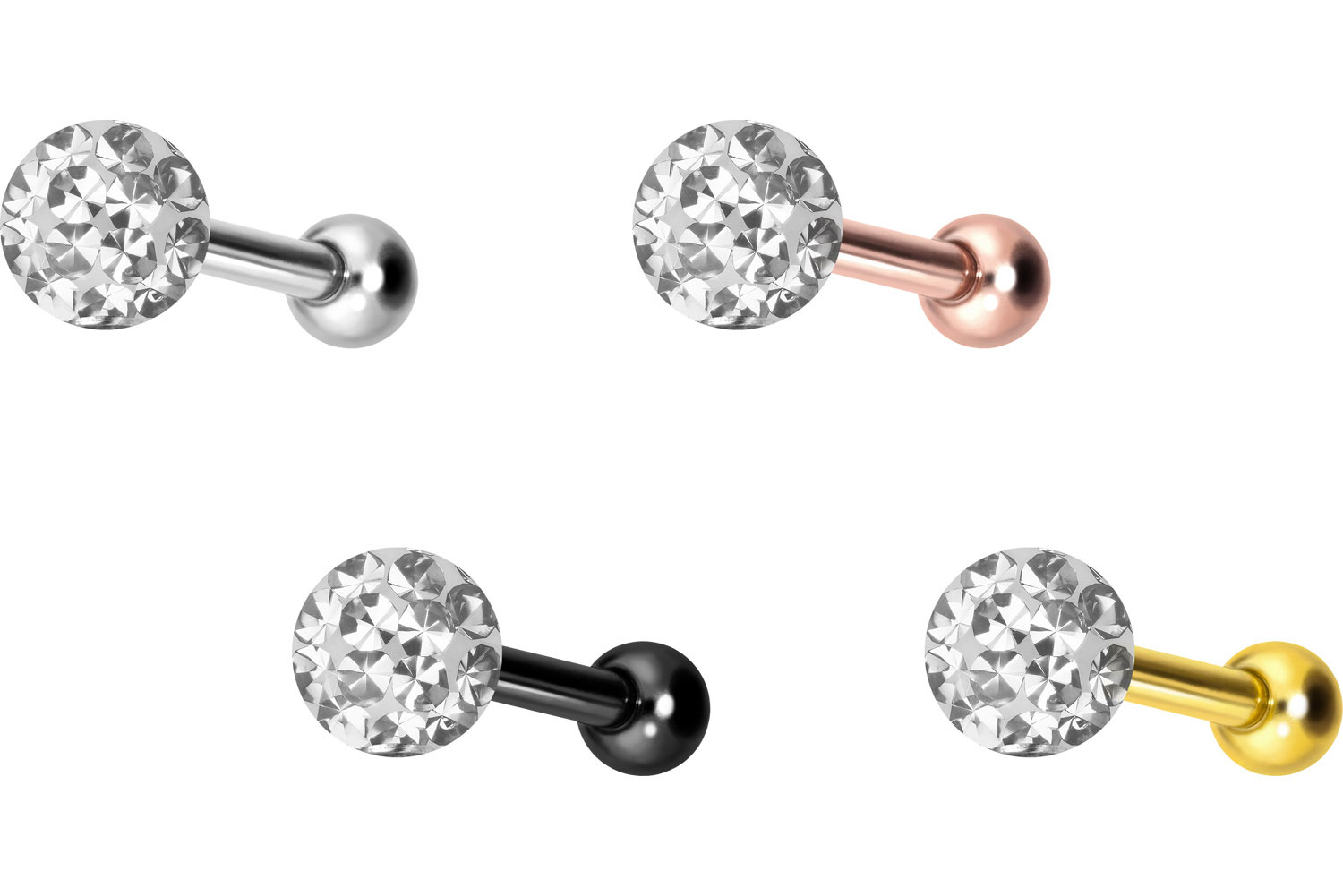 PVD-Beschichtung gewährleistet wird. Die vordere Kugel ist rundherum mit funkelnden Kristallen besetzt und mit einer klaren Schutzschicht aus Epoxidharz überzogen. Dadurch wird ein optimaler Halt und Glanz der Kristalle geboten. Das Ohrpiercing hat eine Stabstärke von 1,2 mm und ist mit einer Stablänge von entweder 6 oder 8 mm erhältlich. Darüber hinaus können sowohl die Epoxy-Kugel als auch die hintere 3 mm Kugel durch das 0,9 mm Innengewinde nach Belieben durch all unsere anderen Schraubaufsätze mit entsprechendem Außengewinde ausgetauscht werden.