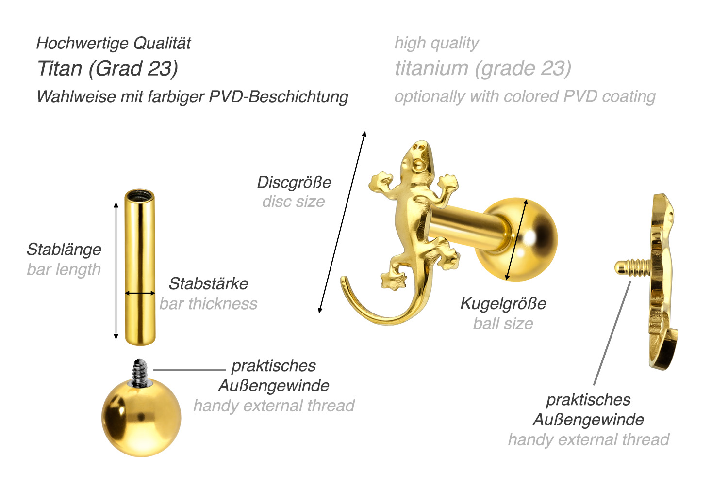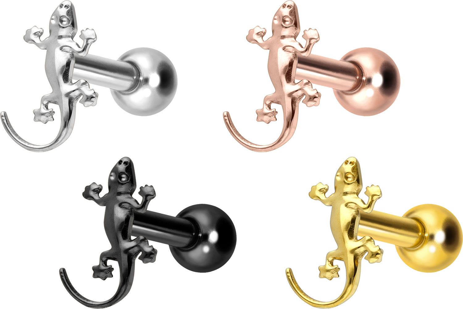 PVD-Beschichtung gewährleistet wird. Visuell überzeugt das Schmuckstück durch den zeitlos schönen Schraubaufsatz mit Außengewinde in Form eines Geckos. Das Ohrpiercing hat eine Stabstärke von 1,2 mm und ist mit einer Stablänge von entweder 6 oder 8 mm erhältlich. Darüber hinaus können sowohl der Aufsatz als auch die hintere 3 mm Kugel durch das 0,9 mm Innengewinde nach Belieben durch all unsere anderen Schraubaufsätze mit entsprechendem Außengewinde ausgetauscht werden.