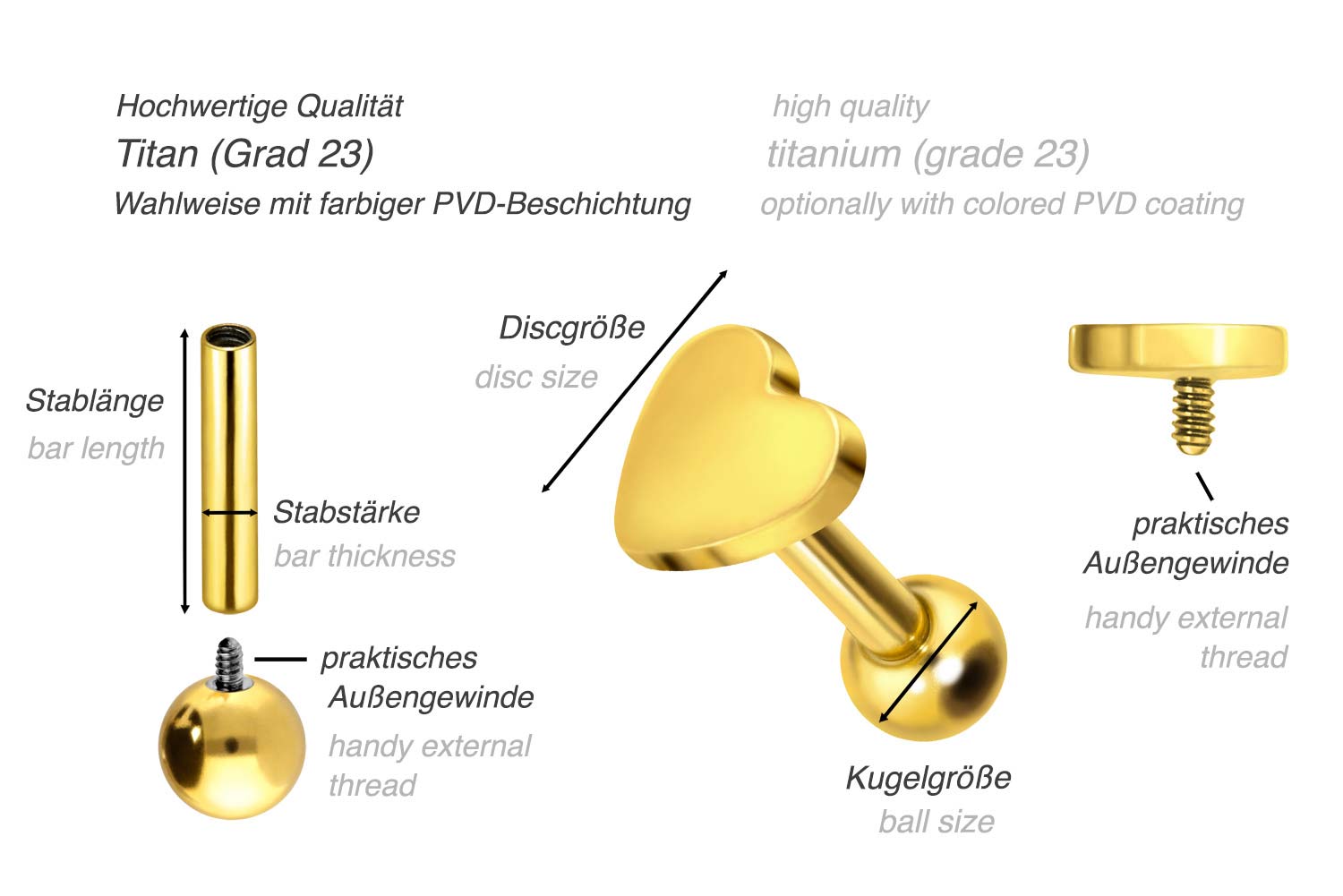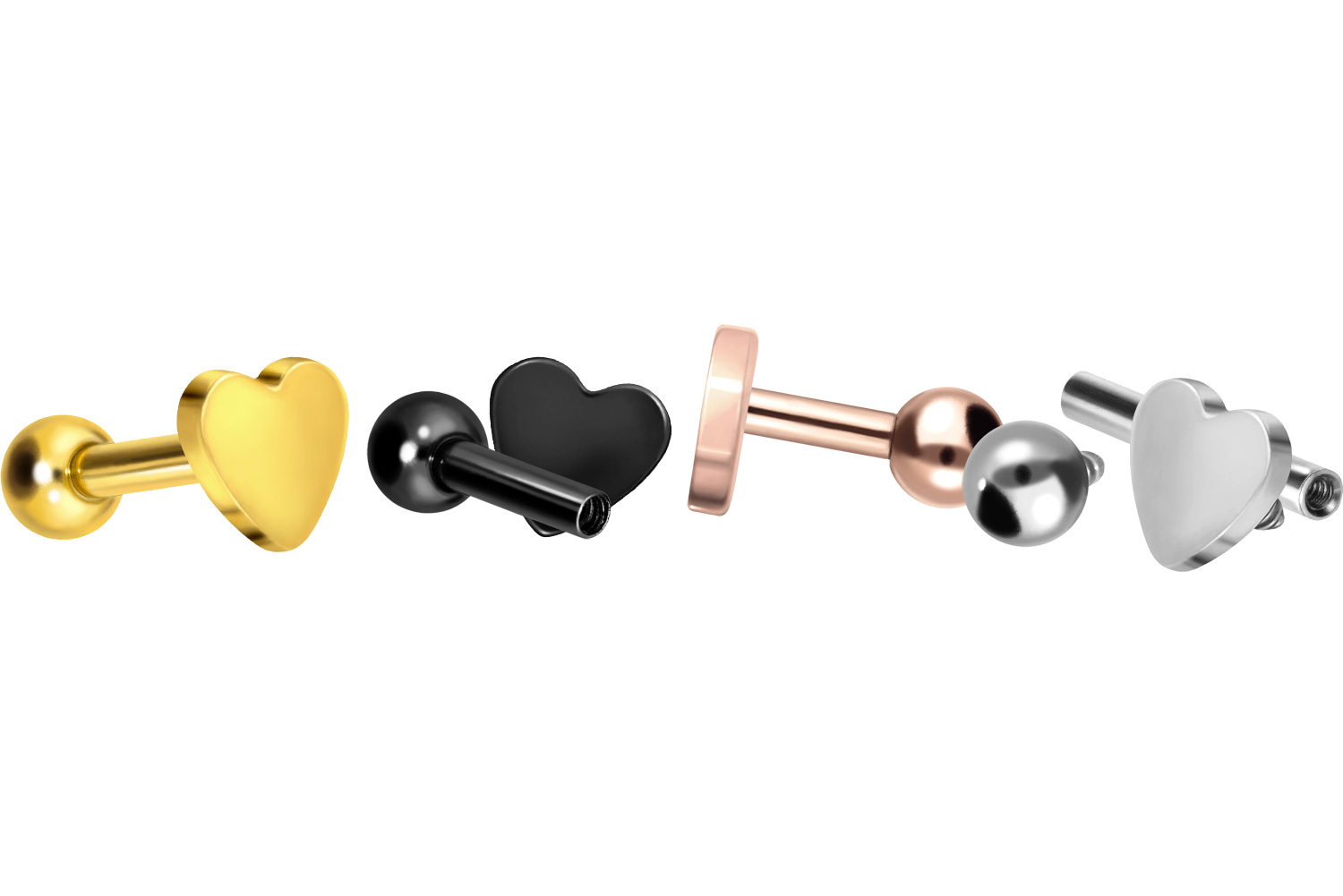 PVD-Beschichtung gewährleistet wird. Visuell überzeugt das Schmuckstück durch den zeitlos schönen Schraubaufsatz mit Außengewinde in Form eines Herzens. Das Ohrpiercing hat eine Stabstärke von 1,2 mm und ist mit einer Stablänge von entweder 6 oder 8 mm erhältlich. Darüber hinaus können sowohl der Aufsatz als auch die hintere 3 mm Kugel durch das 0,9 mm Innengewinde nach Belieben durch all unsere anderen Schraubaufsätze mit entsprechendem Außengewinde ausgetauscht werden.