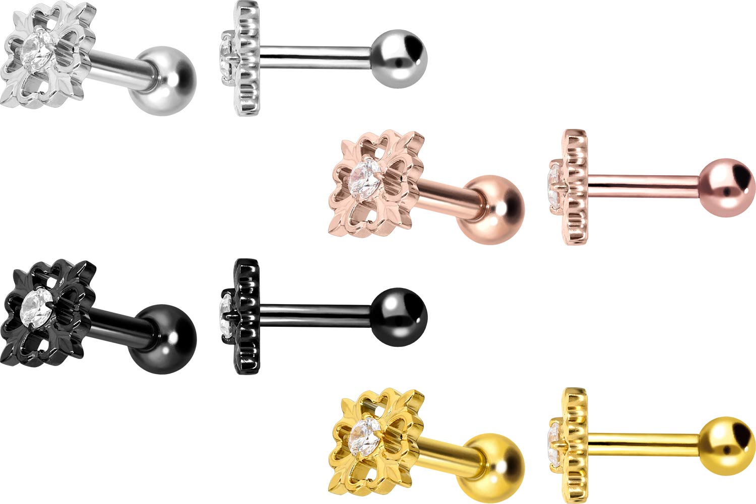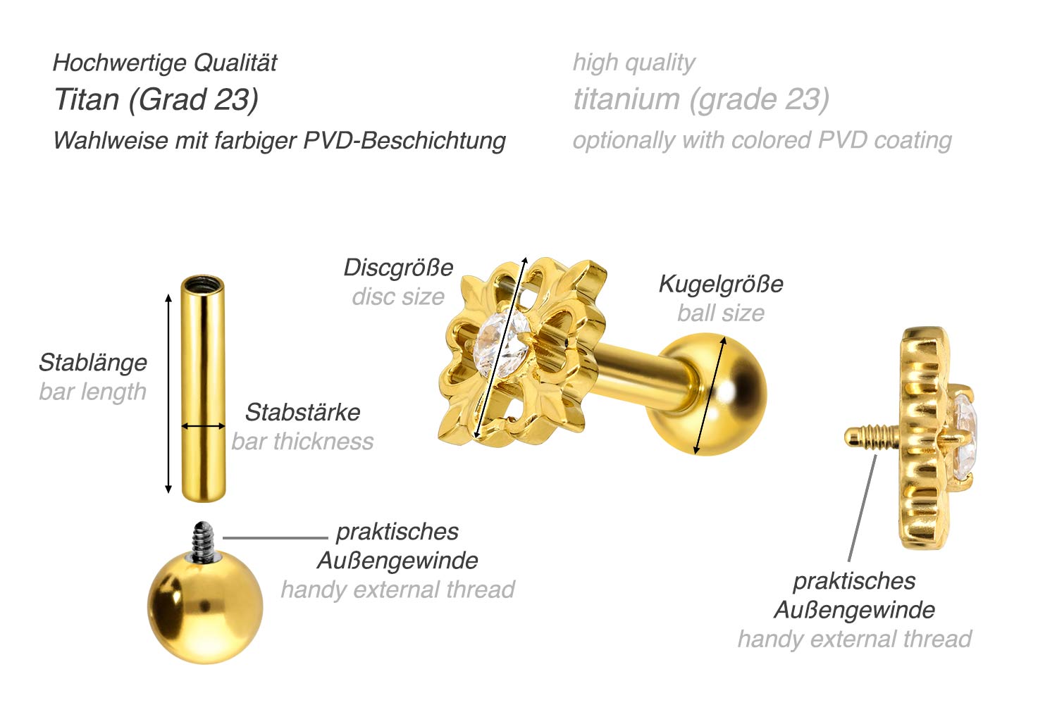 Dieses atemberaubend schöne Ohrpiercing ist aus hochwertigem Titan gefertigt, das auch für Materialeigenschaften wie besonders gute Hautverträglichkeit und hohe Beständigkeit bekannt ist. Ebenfalls zu seinen Vorzügen gehört Farbechtheit, die auch bei den farbigen Varianten mit PVD-Beschichtung gewährleistet wird. Visuell überzeugt das Schmuckstück durch den zeitlos schönen Schraubaufsatz mit Außengewinde in Form eines Kleeblattes. Das Ohrpiercing hat eine Stabstärke von 1,2 mm und ist mit einer Stablänge von entweder 6 oder 8 mm erhältlich. Darüber hinaus können sowohl der Aufsatz als auch die hintere 3 mm Kugel durch das 0,9 mm Innengewinde nach Belieben durch all unsere anderen Schraubaufsätze mit entsprechendem Außengewinde ausgetauscht werden.