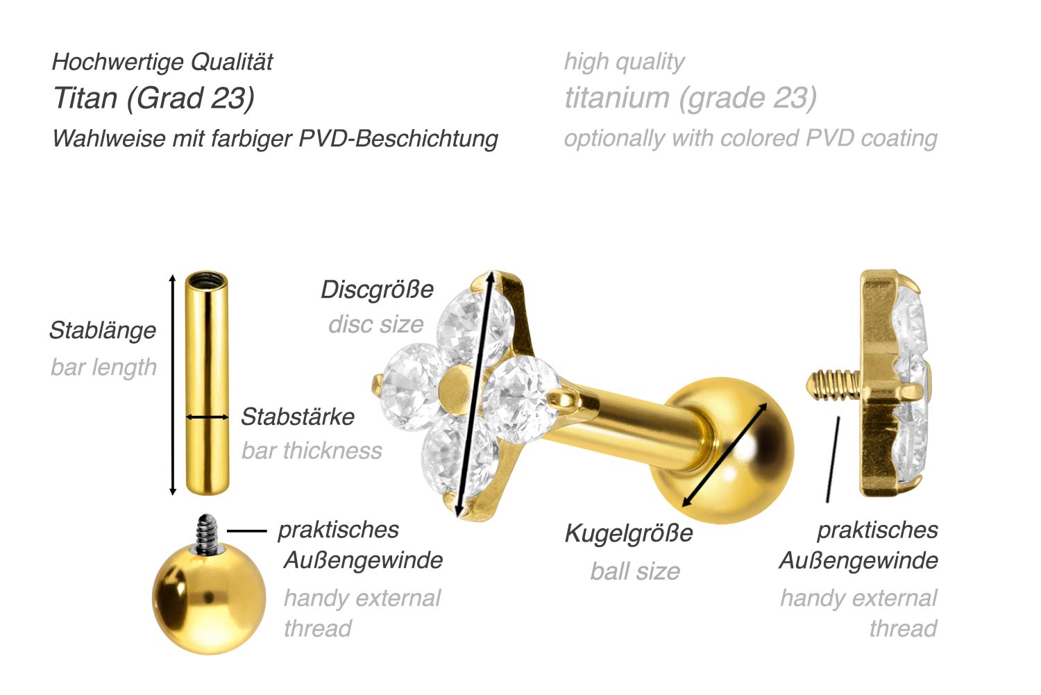 Dieses atemberaubend schöne Ohrpiercing ist aus hochwertigem Titan gefertigt, das auch für Materialeigenschaften wie besonders gute Hautverträglichkeit und hohe Beständigkeit bekannt ist. Ebenfalls zu seinen Vorzügen gehört Farbechtheit, die auch bei den farbigen Varianten mit PVD-Beschichtung gewährleistet wird. Visuell überzeugt das Schmuckstück durch den zeitlos schönen Schraubaufsatz mit Außengewinde in Form einer Blume. Das Ohrpiercing hat eine Stabstärke von 1,2 mm und ist mit einer Stablänge von entweder 6 oder 8 mm erhältlich. Darüber hinaus können sowohl der Aufsatz als auch die hintere 3 mm Kugel durch das 0,9 mm Innengewinde nach Belieben durch all unsere anderen Schraubaufsätze mit entsprechendem Außengewinde ausgetauscht werden.