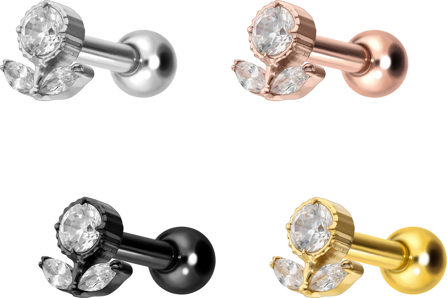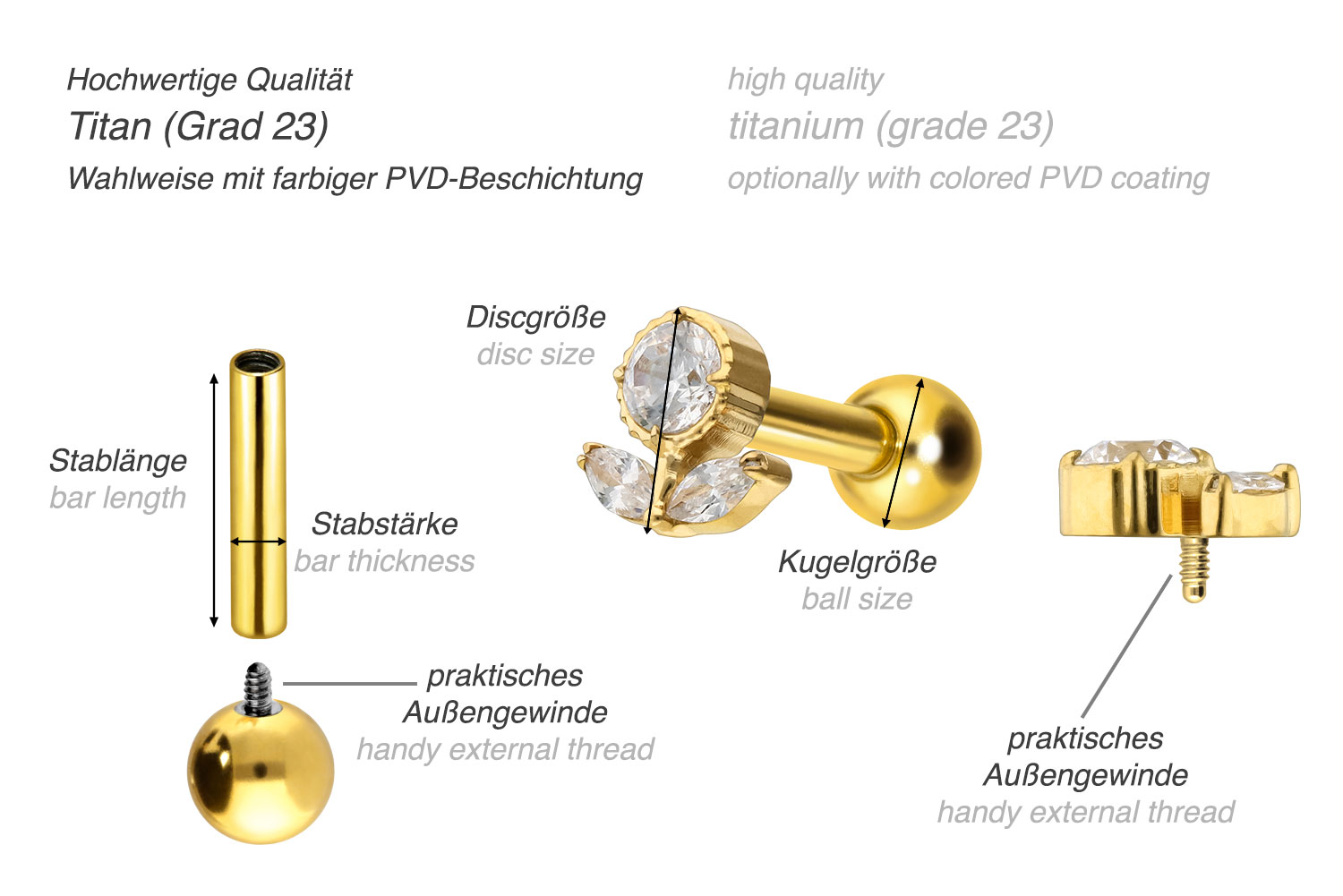Dieses atemberaubend schöne Ohrpiercing ist aus hochwertigem Titan gefertigt, das auch für Materialeigenschaften wie besonders gute Hautverträglichkeit und hohe Beständigkeit bekannt ist. Ebenfalls zu seinen Vorzügen gehört Farbechtheit, die auch bei den farbigen Varianten mit PVD-Beschichtung gewährleistet wird. Visuell überzeugt das Schmuckstück durch den zeitlos schönen Schraubaufsatz mit Außengewinde in Form einer Kristallblume. Das Ohrpiercing hat eine Stabstärke von 1,2 mm und ist mit einer Stablänge von entweder 6 oder 8 mm erhältlich. Darüber hinaus können sowohl der Aufsatz als auch die hintere 3 mm Kugel durch das 0,9 mm Innengewinde nach Belieben durch all unsere anderen Schraubaufsätze mit entsprechendem Außengewinde ausgetauscht werden.