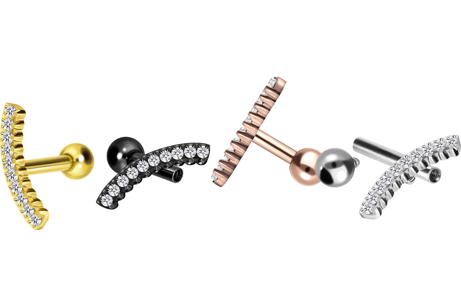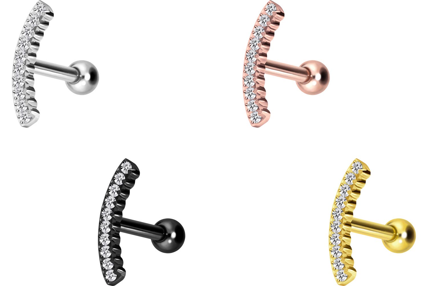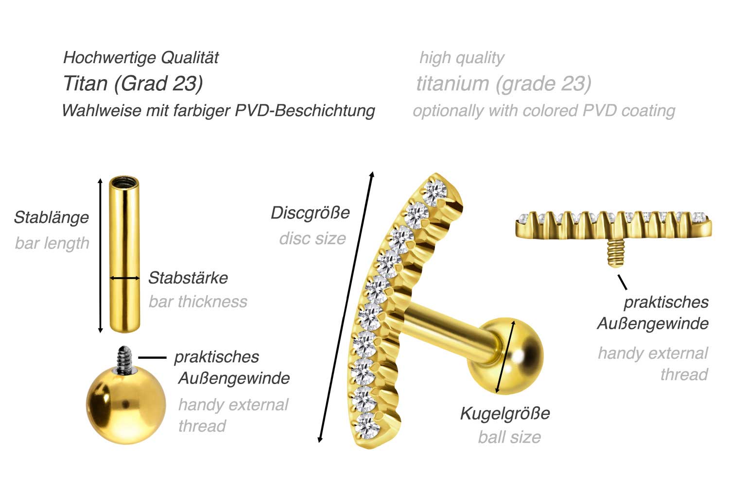 PVD-Beschichtung gewährleistet wird. Visuell überzeugt das Schmuckstück durch den zeitlos schönen Schraubaufsatz mit Außengewinde in Form eines funkelnden Kristallbogens mit Fassungen. Das Ohrpiercing hat eine Stabstärke von 1,2 mm und ist mit einer Stablänge von entweder 6 oder 8 mm erhältlich. Darüber hinaus können sowohl der Aufsatz als auch die hintere 3 mm Kugel durch das 0,9 mm Innengewinde nach Belieben durch all unsere anderen Schraubaufsätze mit entsprechendem Außengewinde ausgetauscht werden.