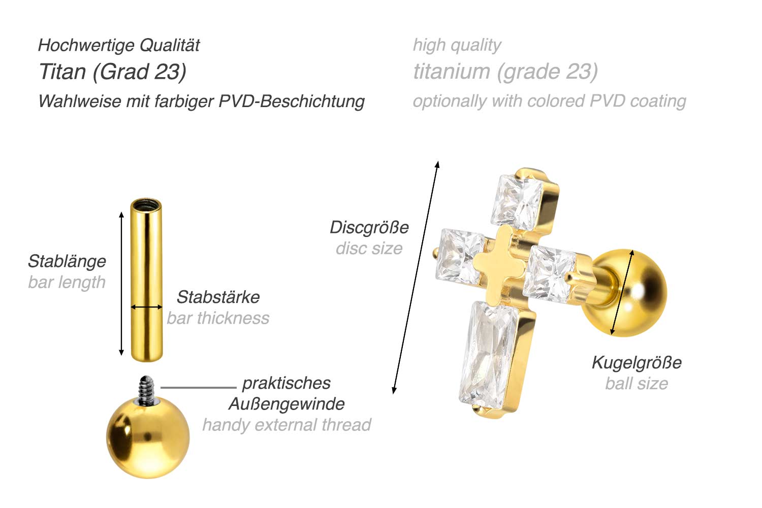 Dieses atemberaubend schöne Ohrpiercing ist aus hochwertigem Titan gefertigt, das auch für Materialeigenschaften wie besonders gute Hautverträglichkeit und hohe Beständigkeit bekannt ist. Ebenfalls zu seinen Vorzügen gehört Farbechtheit, die auch bei den farbigen Varianten mit PVD-Beschichtung gewährleistet wird. Visuell überzeugt das Schmuckstück durch den zeitlos schönen Schraubaufsatz mit Außengewinde in Form eines Kristallkreuzes. Das Ohrpiercing hat eine Stabstärke von 1,2 mm und ist mit einer Stablänge von entweder 6 oder 8 mm erhältlich. Darüber hinaus können sowohl der Aufsatz als auch die hintere 3 mm Kugel durch das 0,9 mm Innengewinde nach Belieben durch all unsere anderen Schraubaufsätze mit entsprechendem Außengewinde ausgetauscht werden.
