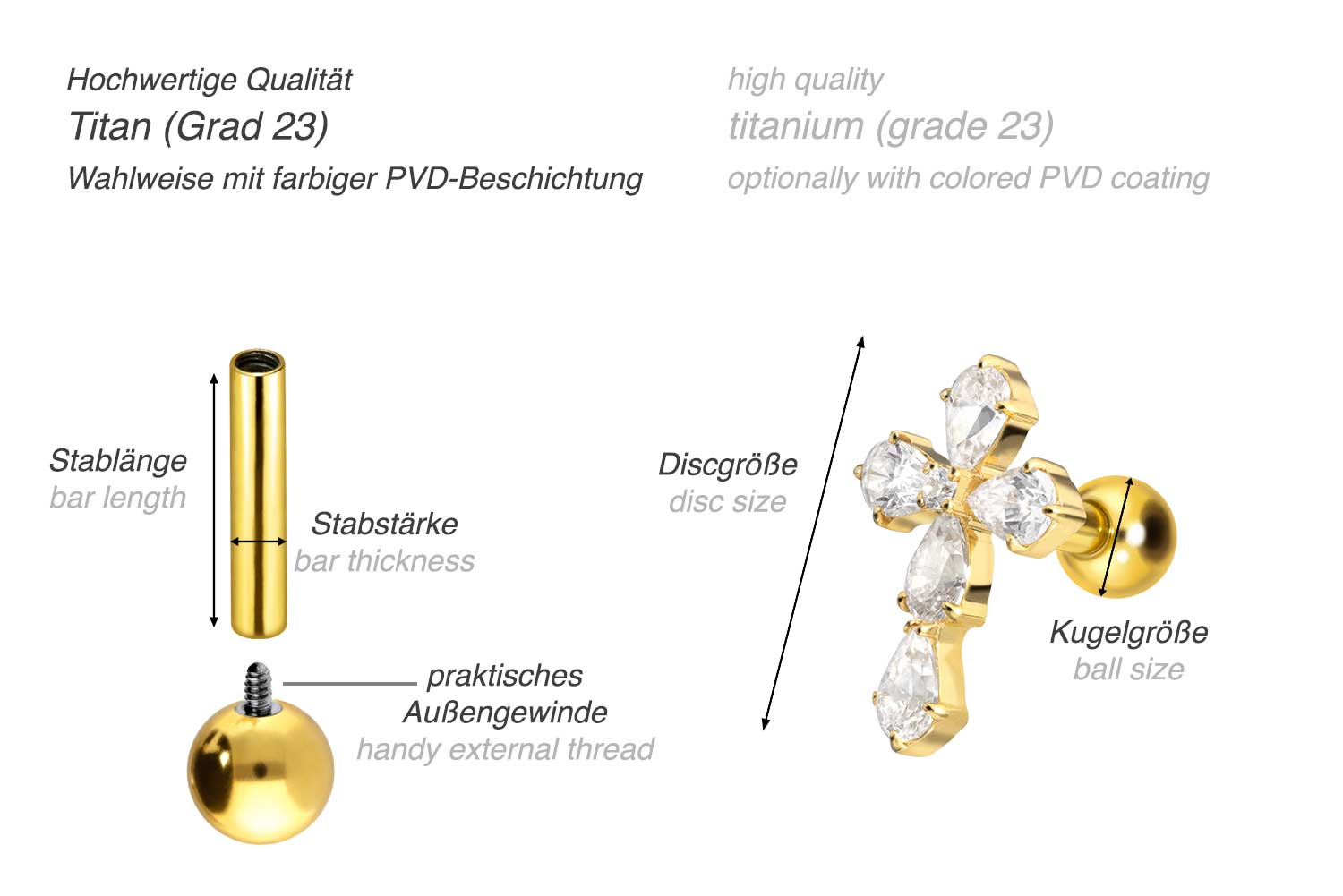 Dieses atemberaubend schöne Ohrpiercing ist aus hochwertigem Titan gefertigt, das auch für Materialeigenschaften wie besonders gute Hautverträglichkeit und hohe Beständigkeit bekannt ist. Ebenfalls zu seinen Vorzügen gehört Farbechtheit, die auch bei den farbigen Varianten mit PVD-Beschichtung gewährleistet wird. Visuell überzeugt das Schmuckstück durch den zeitlos schönen Schraubaufsatz mit Außengewinde in Form eines Kristallkreuzes. Das Ohrpiercing hat eine Stabstärke von 1,2 mm und ist mit einer Stablänge von entweder 6 oder 8 mm erhältlich. Darüber hinaus können sowohl der Aufsatz als auch die hintere 3 mm Kugel durch das 0,9 mm Innengewinde nach Belieben durch all unsere anderen Schraubaufsätze mit entsprechendem Außengewinde ausgetauscht werden.