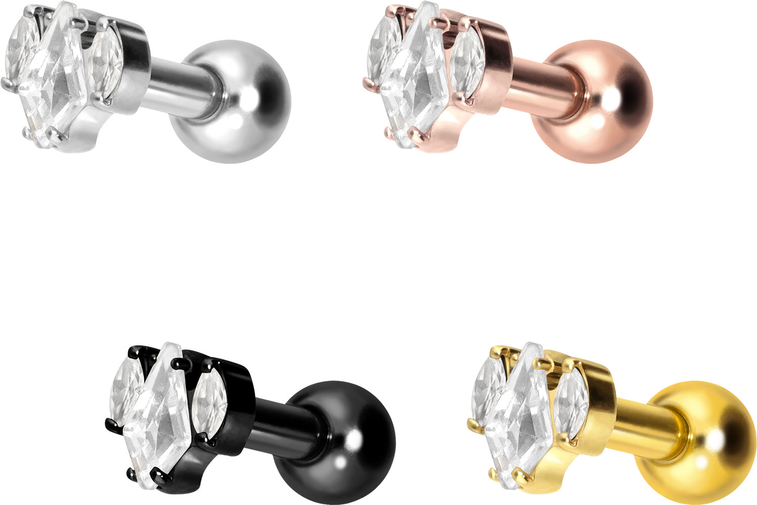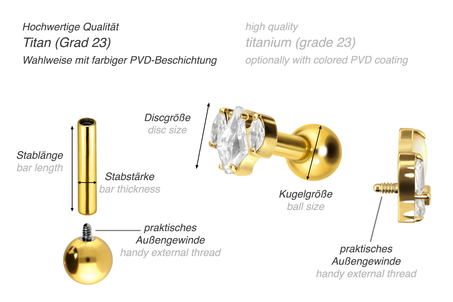 Dieses atemberaubend schöne Ohrpiercing ist aus hochwertigem Titan gefertigt, das auch für Materialeigenschaften wie besonders gute Hautverträglichkeit und hohe Beständigkeit bekannt ist. Ebenfalls zu seinen Vorzügen gehört Farbechtheit, die auch bei den farbigen Varianten mit PVD-Beschichtung gewährleistet wird. Visuell überzeugt das Schmuckstück durch den zeitlos schönen Schraubaufsatz mit Außengewinde in Form eines funkelnden Kristallschilds kombiniert mit mehreren Kristallovalen. Das Ohrpiercing hat eine Stabstärke von 1,2 mm und ist mit einer Stablänge von entweder 6 oder 8 mm erhältlich. Darüber hinaus können sowohl der Aufsatz als auch die hintere 3 mm Kugel durch das 0,9 mm Innengewinde nach Belieben durch all unsere anderen Schraubaufsätze mit entsprechendem Außengewinde ausgetauscht werden.