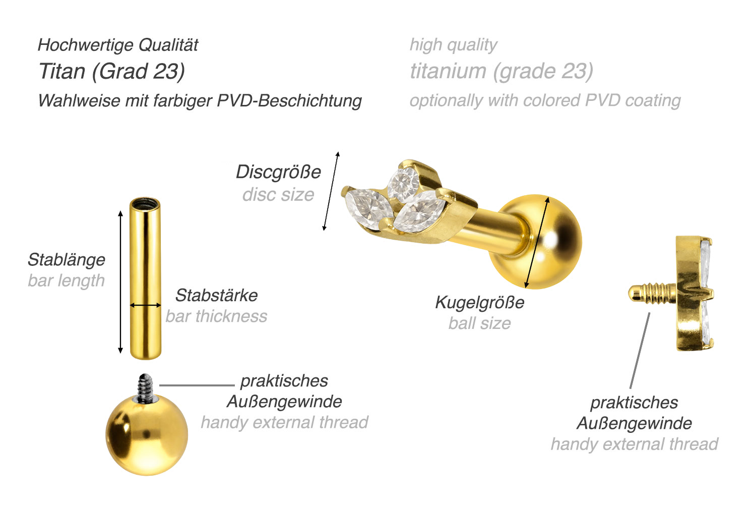 Dieses atemberaubend schöne Ohrpiercing ist aus hochwertigem Titan gefertigt, das auch für Materialeigenschaften wie besonders gute Hautverträglichkeit und hohe Beständigkeit bekannt ist. Ebenfalls zu seinen Vorzügen gehört Farbechtheit, die auch bei den farbigen Varianten mit PVD-Beschichtung gewährleistet wird. Visuell überzeugt das Schmuckstück durch den zeitlos schönen Schraubaufsatz mit Außengewinde in Form einer Lotusblüte. Das Ohrpiercing hat eine Stabstärke von 1,2 mm und ist mit einer Stablänge von entweder 6 oder 8 mm erhältlich. Darüber hinaus können sowohl der Aufsatz als auch die hintere 3 mm Kugel durch das 0,9 mm Innengewinde nach Belieben durch all unsere anderen Schraubaufsätze mit entsprechendem Außengewinde ausgetauscht werden.