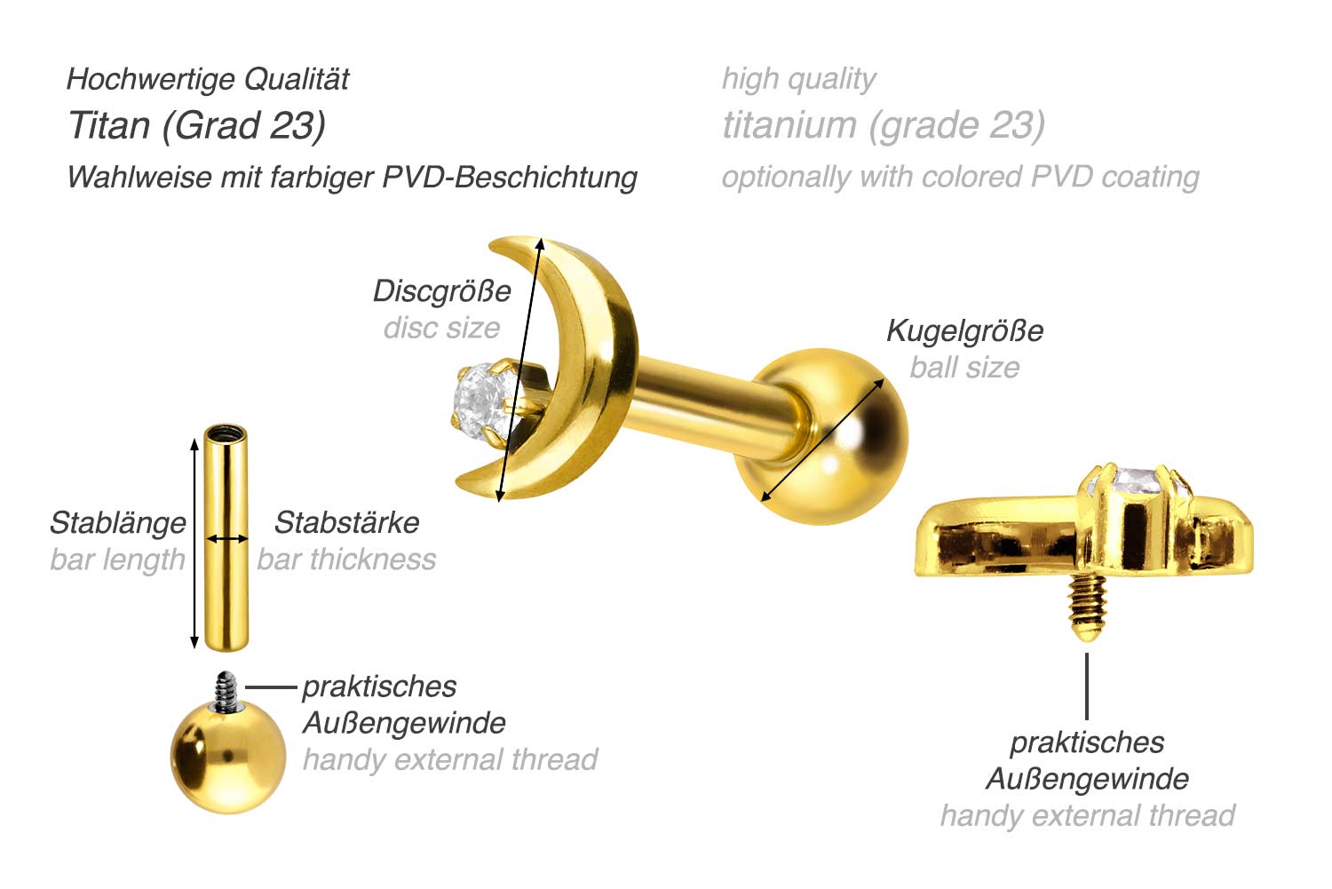PVD-Beschichtung gewährleistet wird. Visuell überzeugt das Schmuckstück durch den zeitlos schönen Schraubaufsatz mit Außengewinde in Form eines Mondes, welcher mit einem funkelnden Kristall verziert ist. Das Ohrpiercing hat eine Stabstärke von 1,2 mm und ist mit einer Stablänge von entweder 6 oder 8 mm erhältlich. Darüber hinaus können sowohl der Aufsatz als auch die hintere 3 mm Kugel durch das 0,9 mm Innengewinde nach Belieben durch all unsere anderen Schraubaufsätze mit entsprechendem Außengewinde ausgetauscht werden.