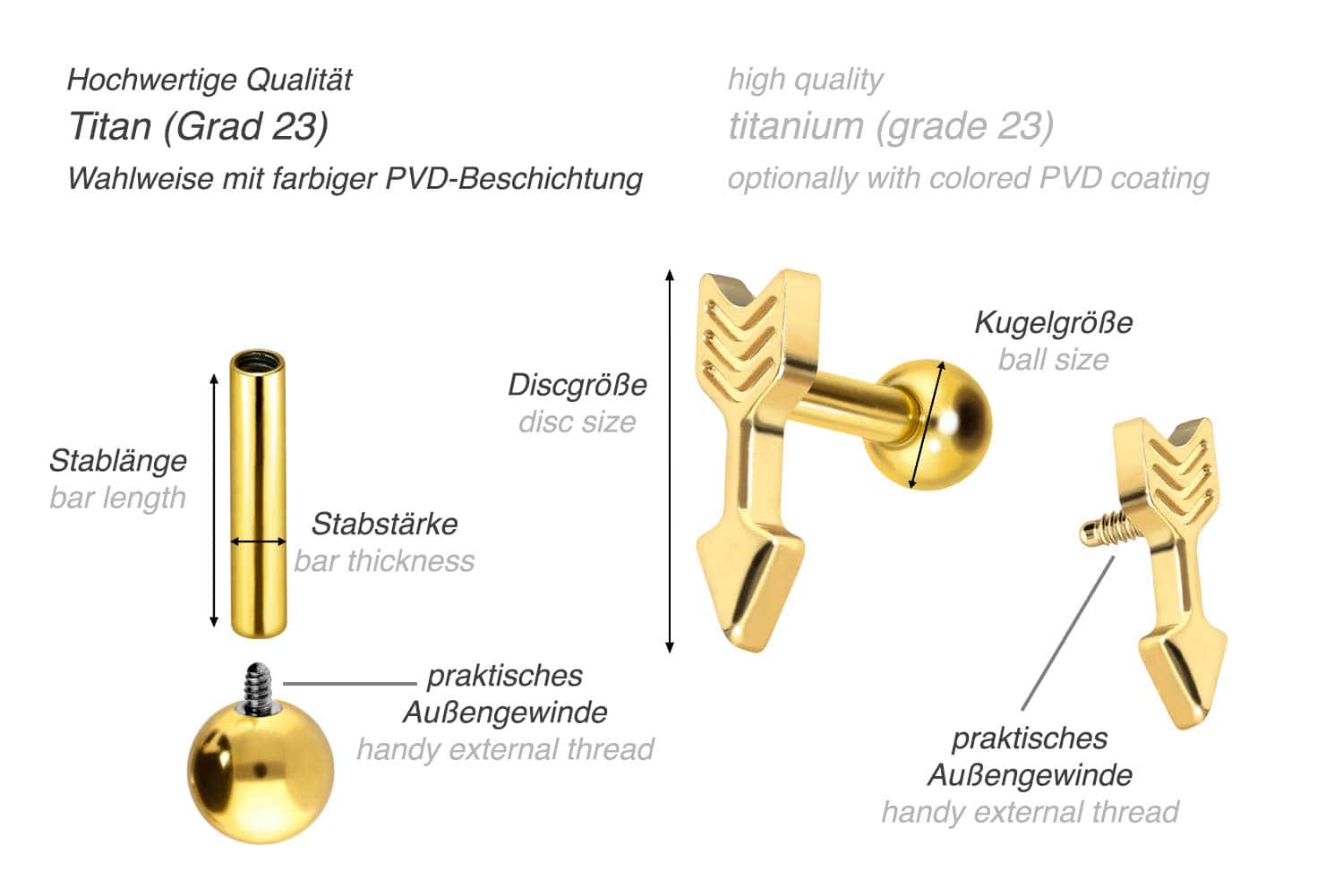 Dieses atemberaubend schöne Ohrpiercing ist aus hochwertigem Titan gefertigt, das auch für Materialeigenschaften wie besonders gute Hautverträglichkeit und hohe Beständigkeit bekannt ist. Ebenfalls zu seinen Vorzügen gehört Farbechtheit, die auch bei den farbigen Varianten mit PVD-Beschichtung gewährleistet wird. Visuell überzeugt das Schmuckstück durch den zeitlos schönen Schraubaufsatz mit Außengewinde in Form eines Pfeils. Das Ohrpiercing hat eine Stabstärke von 1,2 mm und ist mit einer Stablänge von entweder 6 oder 8 mm erhältlich. Darüber hinaus können sowohl der Aufsatz als auch die hintere 3 mm Kugel durch das 0,9 mm Innengewinde nach Belieben durch all unsere anderen Schraubaufsätze mit entsprechendem Außengewinde ausgetauscht werden.