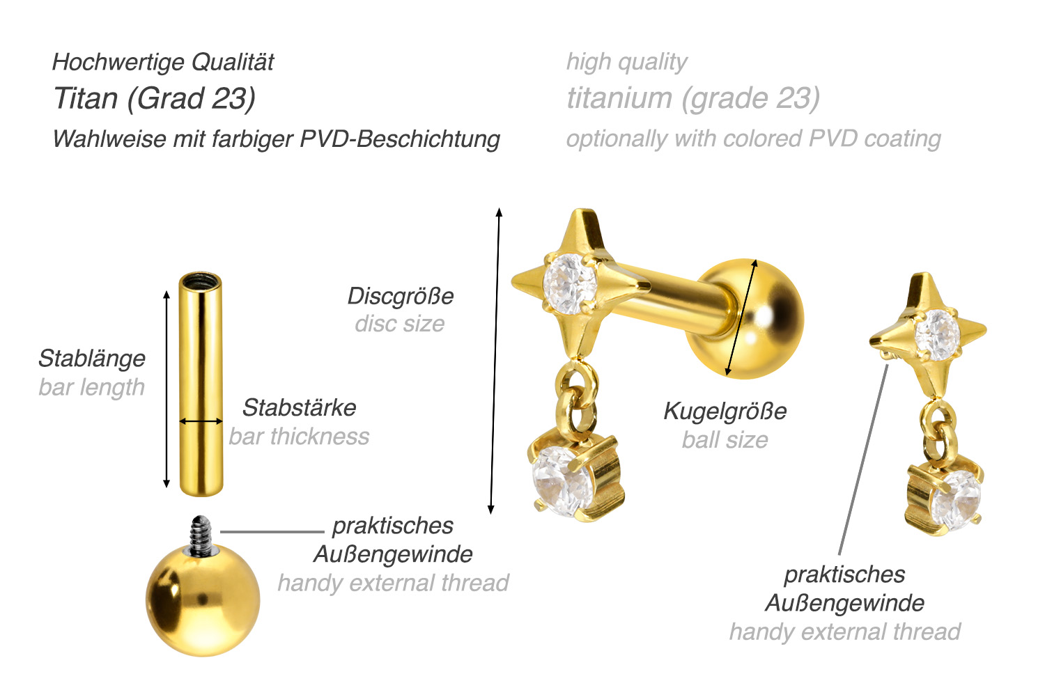 Dieses atemberaubend schöne Ohrpiercing ist aus hochwertigem Titan gefertigt, das auch für Materialeigenschaften wie besonders gute Hautverträglichkeit und hohe Beständigkeit bekannt ist. Ebenfalls zu seinen Vorzügen gehört Farbechtheit, die auch bei den farbigen Varianten mit PVD-Beschichtung gewährleistet wird. Visuell überzeugt das Schmuckstück durch den zeitlos schönen Schraubaufsatz mit Außengewinde in Form eines Sterns, an welchem ein funkelnder Kristall befestigt ist. Das Ohrpiercing hat eine Stabstärke von 1,2 mm und ist mit einer Stablänge von entweder 6 oder 8 mm erhältlich. Darüber hinaus können sowohl der Aufsatz als auch die hintere 3 mm Kugel durch das 0,9 mm Innengewinde nach Belieben durch all unsere anderen Schraubaufsätze mit entsprechendem Außengewinde ausgetauscht werden.
