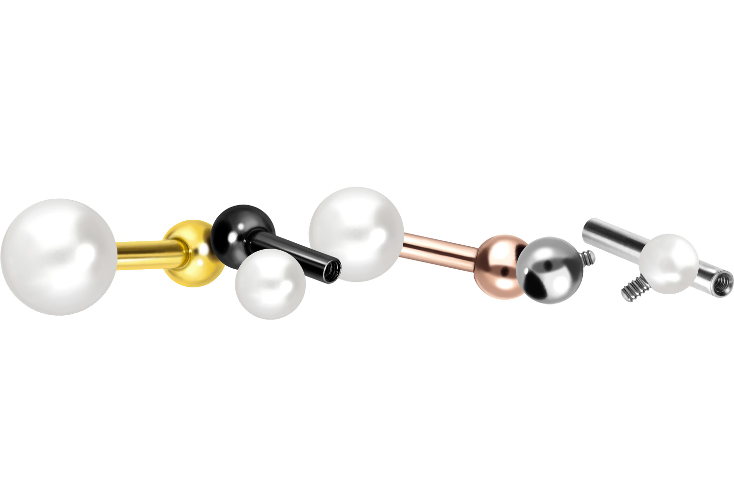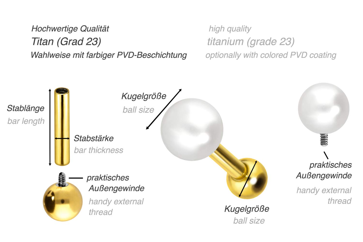 PVD-Beschichtung gewährleistet wird. Visuell überzeugt das Schmuckstück durch die zeitlos schöne synthetische Schraubperle. Das Ohrpiercing hat eine Stabstärke von 1,2 mm und ist mit einer Stablänge von entweder 6 oder 8 mm erhältlich. Darüber hinaus können sowohl der Aufsatz als auch die hintere 3 mm Kugel durch das 0,9 mm Innengewinde nach Belieben durch all unsere anderen Schraubaufsätze mit entsprechendem Außengewinde ausgetauscht werden.