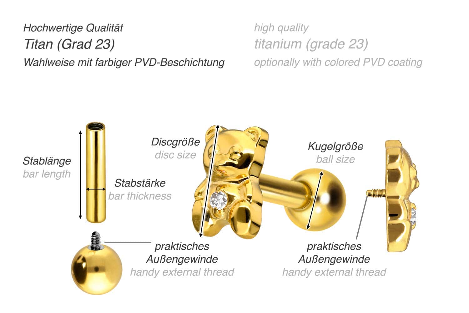 Dieses atemberaubend schöne Ohrpiercing ist aus hochwertigem Titan gefertigt, das auch für Materialeigenschaften wie besonders gute Hautverträglichkeit und hohe Beständigkeit bekannt ist. Ebenfalls zu seinen Vorzügen gehört Farbechtheit, die auch bei den farbigen Varianten mit PVD-Beschichtung gewährleistet wird. Visuell überzeugt das Schmuckstück durch den zeitlos schönen Schraubaufsatz mit Außengewinde in Form eines Teddybären. Das Ohrpiercing hat eine Stabstärke von 1,2 mm und ist mit einer Stablänge von entweder 6 oder 8 mm erhältlich. Darüber hinaus können sowohl der Aufsatz als auch die hintere 3 mm Kugel durch das 0,9 mm Innengewinde nach Belieben durch all unsere anderen Schraubaufsätze mit entsprechendem Außengewinde ausgetauscht werden.