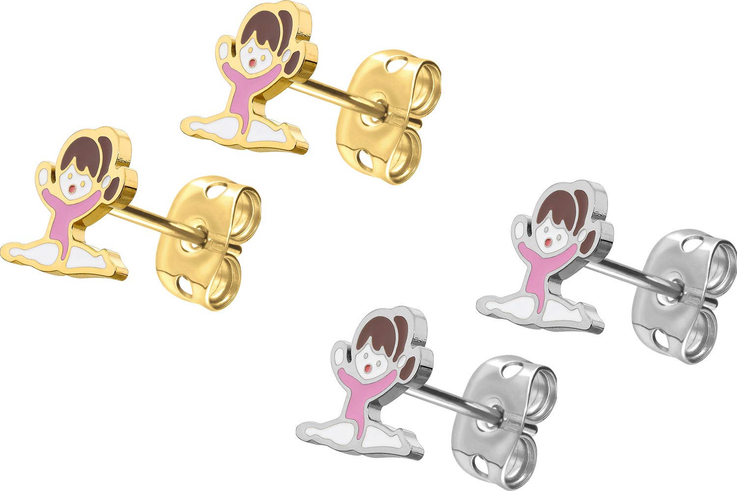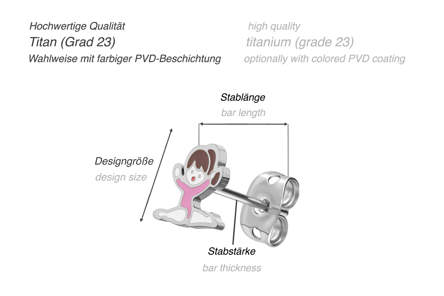 Diese zeitlos schönen Ohrstecker bestehen aus hochwertigem Titan, das sich unter anderem durch gute Hautverträglichkeit und hohe Beständigkeit auszeichnet. Ebenfalls zu seinen spezifischen Materialeigenschaften gehört Farbechtheit, die auch bei den Varianten mit goldfarbener PVD-Beschichtung gewährleistet wird. Das Design in Form einer Ballerina, das sich an den vorderen Enden der Stecker befindet, ist aufgrund der Gestaltung besonders für Kinder ansprechend. Sie werden darüber hinaus, wie abgebildet, paarweise geliefert.