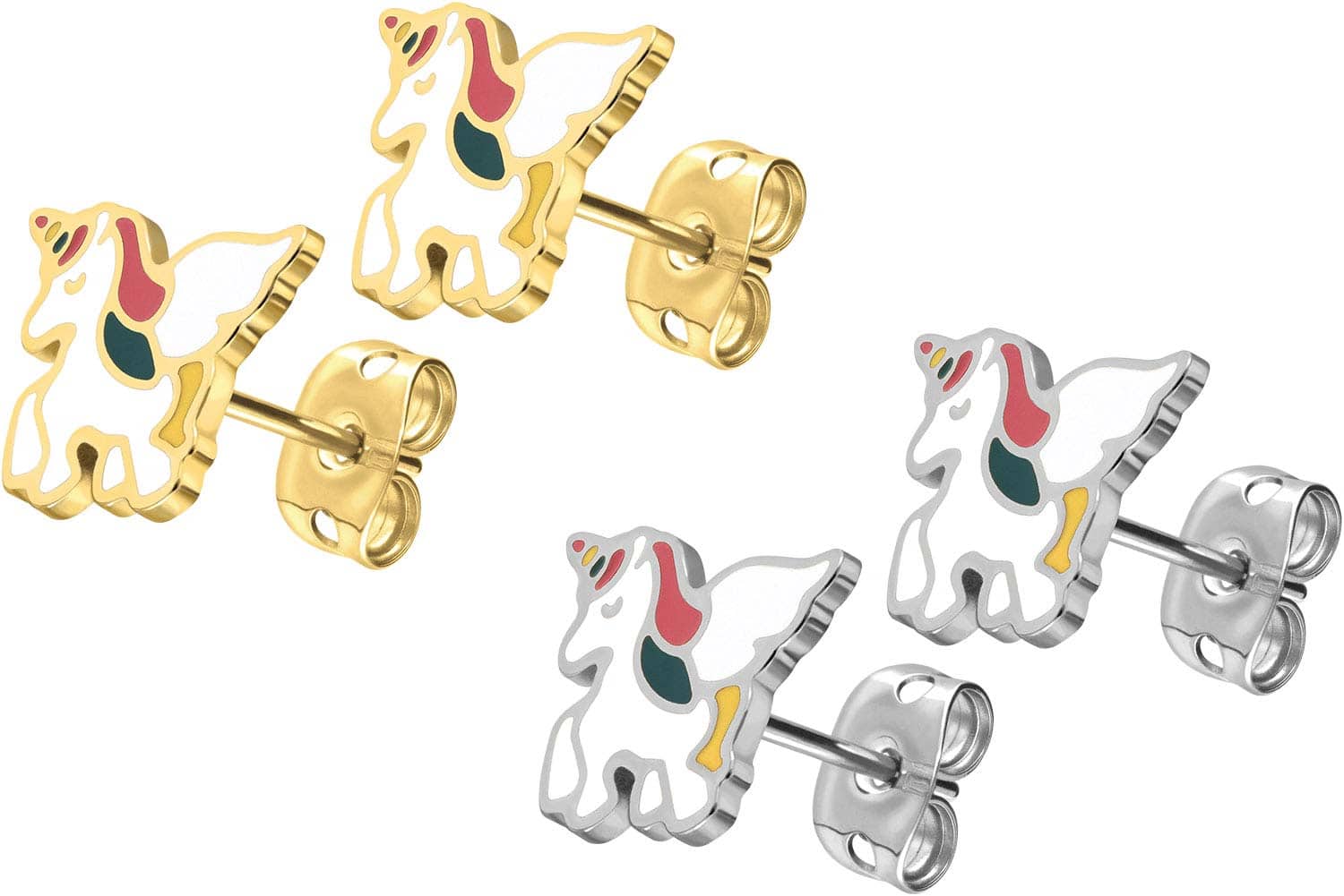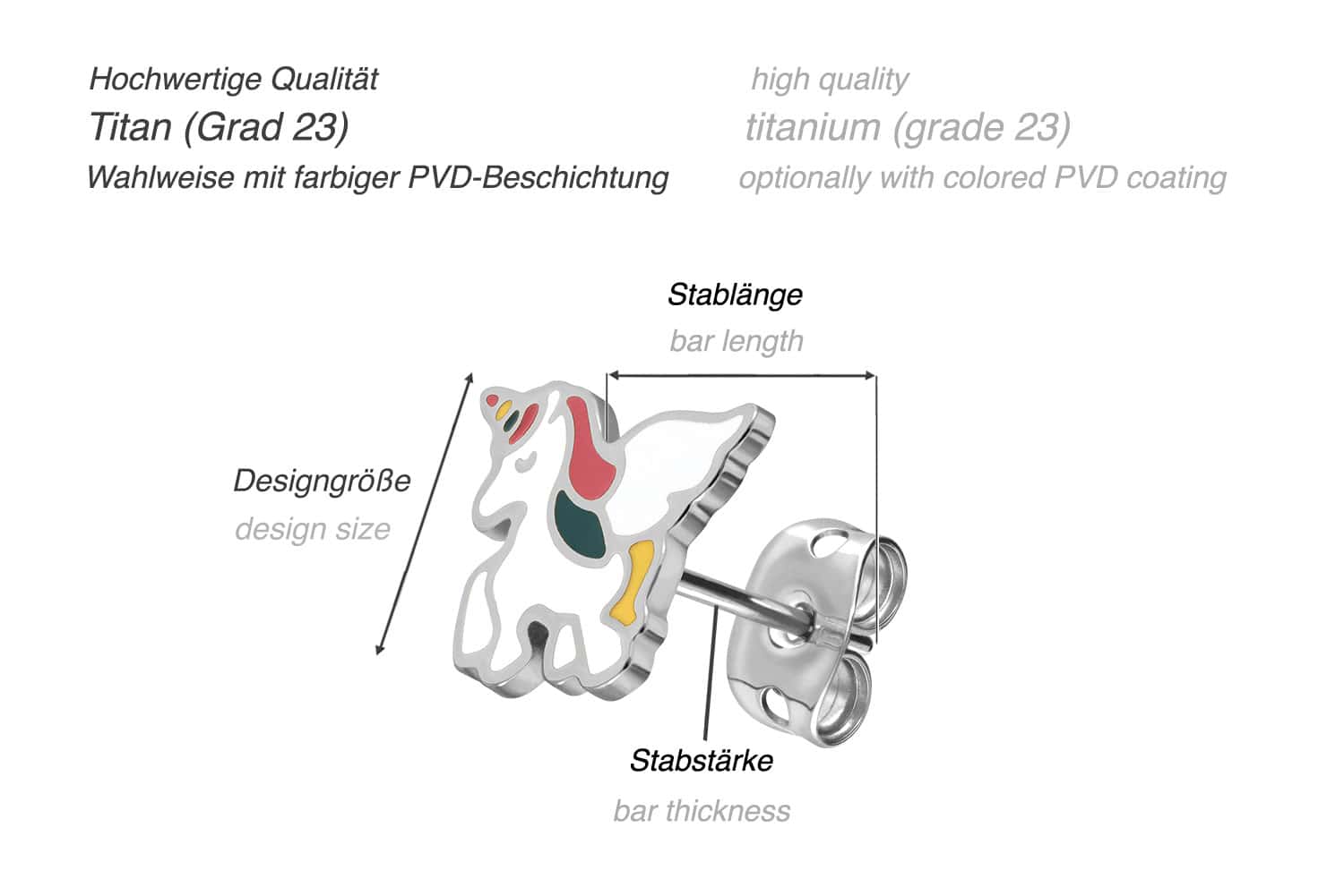Diese zeitlos schönen Ohrstecker bestehen aus hochwertigem Titan, das sich unter anderem durch gute Hautverträglichkeit und hohe Beständigkeit auszeichnet. Ebenfalls zu seinen spezifischen Materialeigenschaften gehört Farbechtheit, die auch bei den Varianten mit goldfarbener PVD-Beschichtung gewährleistet wird. Das Design in Form eines Pegasus, das sich an den vorderen Enden der Stecker befindet, ist aufgrund der Gestaltung besonders für Kinder ansprechend. Sie werden darüber hinaus, wie abgebildet, paarweise geliefert.