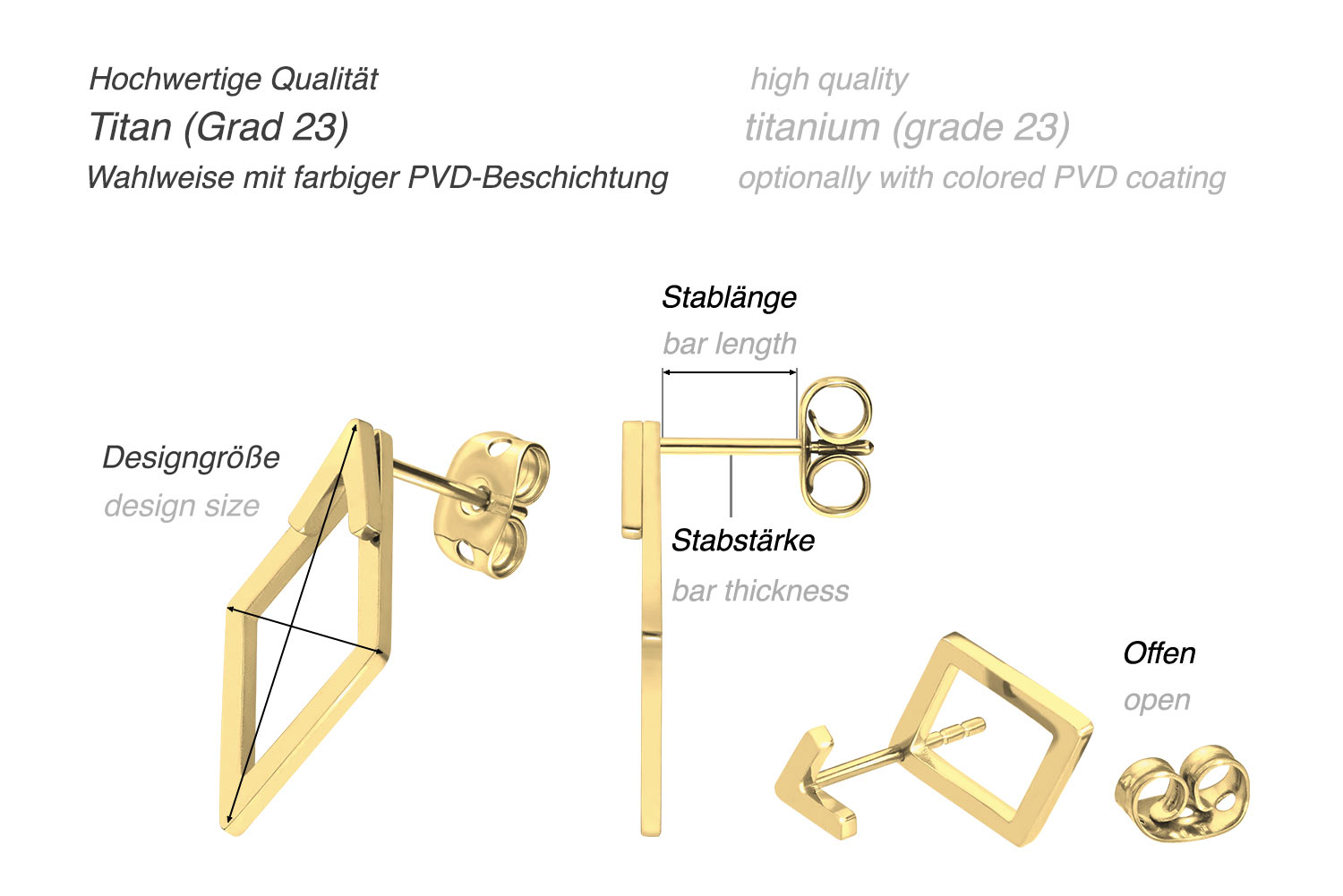 Diese zeitlos schönen Ohrstecker bestehen aus hochwertigem Titan, das sich unter anderem durch gute Hautverträglichkeit und hohe Beständigkeit auszeichnet. Ebenfalls zu seinen spezifischen Materialeigenschaften gehört Farbechtheit, die auch bei den Varianten mit PVD-Beschichtung gewährleistet wird. Der sich an den vorderen Enden der Stecker befindende Teil des schlichten Design ist fest mit dem Stab verbunden, während die bewegliche Raute individuell an das Ohr angepasst werden kann. Darüber hinaus werden die Ohrstecker, wie abgebildet, paarweise geliefert.