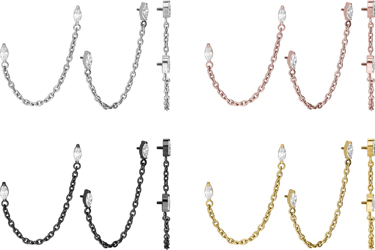 Dieser zeitlos schöne Schraubaufsatz in Form von zwei separaten Kristalltropfen, welche über eine Kette verbunden sind, wurde speziell für unsere Innengewinde-Piercings